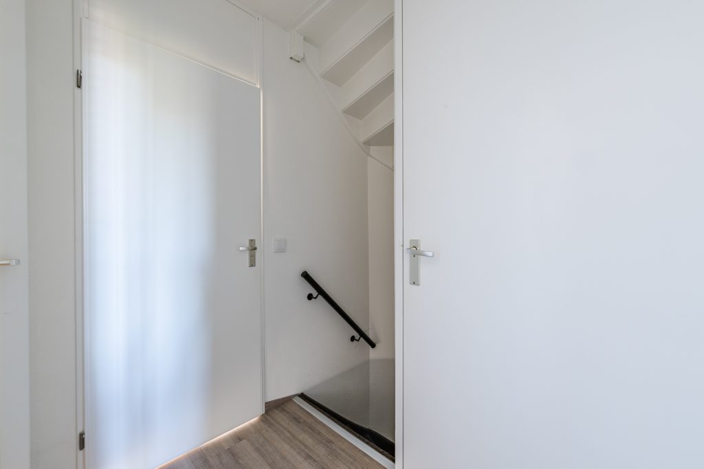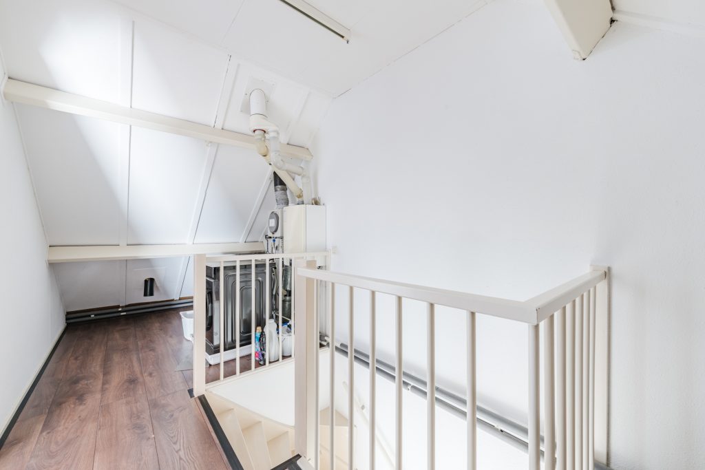 De vaste trap brengt je naar de zolderverdieping, die verrassend veel ruimte biedt. Op de voorzolder bevinden zich bergruimtes onder de schuine kanten, de cv-installatie (Remeha, 2006) en de aansluitingen voor wasmachine en droger.