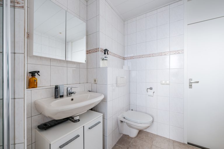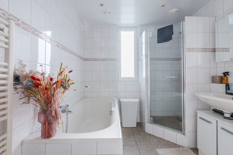 De badkamer is compleet en stijlvol afgewerkt. Deze beschikt over een ligbad, inloopdouche, wastafelmeubel, hangcloset, designradiator, mechanische ventilatie en inbouwspots.
