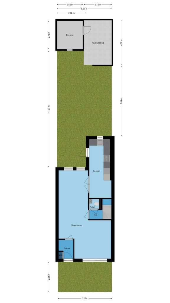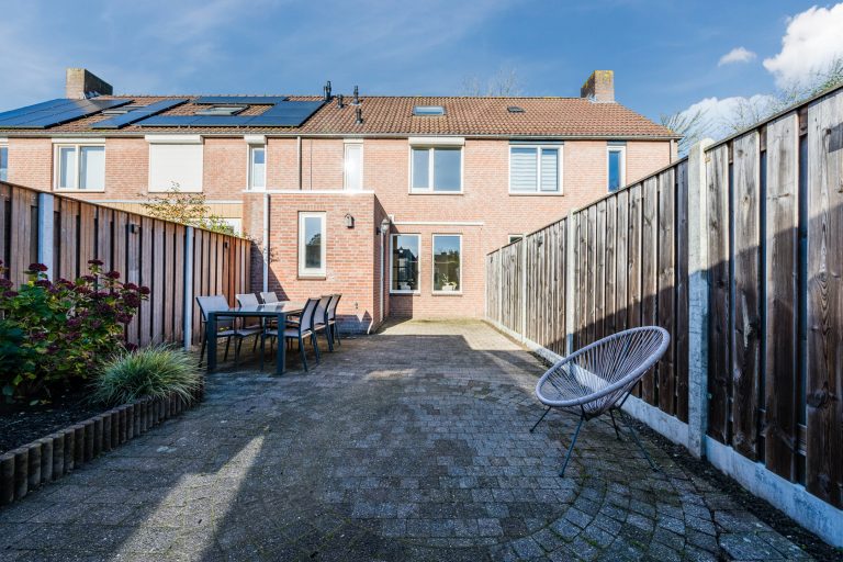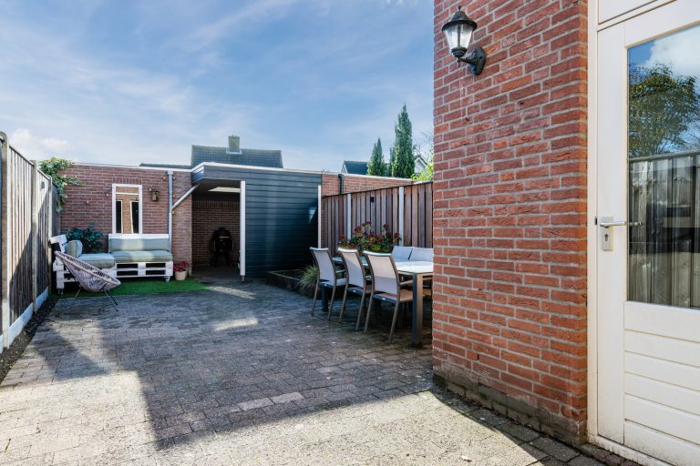De fraai aangelegde achtertuin ligt op het zuidoosten en biedt veel zon en privacy. De tuin is onderhoudsvriendelijk ingericht met sierbestrating, kunstgras, een plantenborder met beplanting, en een eigen achterom. Achterin de tuin is een overkapping geplaatst, ideaal voor extra opslag of voor het creëren van een zitje. Aansluitend bevindt zich een stenen berging met elektra, perfect voor fietsen en tuingereedschap. Er is bovendien een buitenkraantje aan zowel de voor- als achterzijde van de woning.