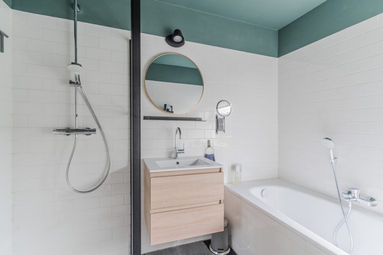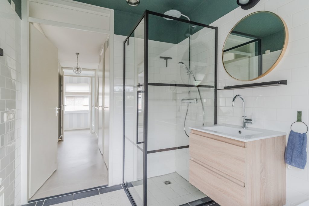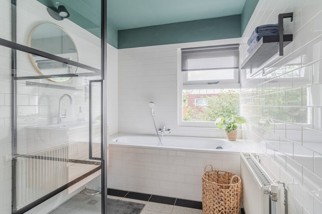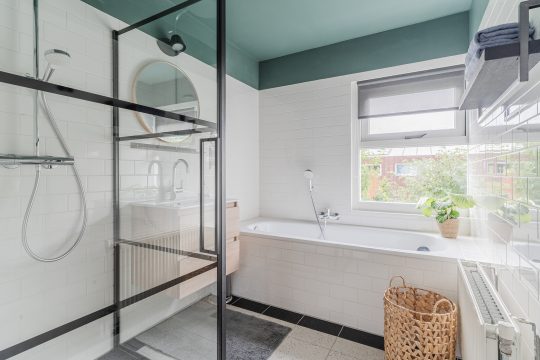 Grotendeels betegelde moderne badkamer voorzien van een ligbad, douchecabine en wastafelmeubel.