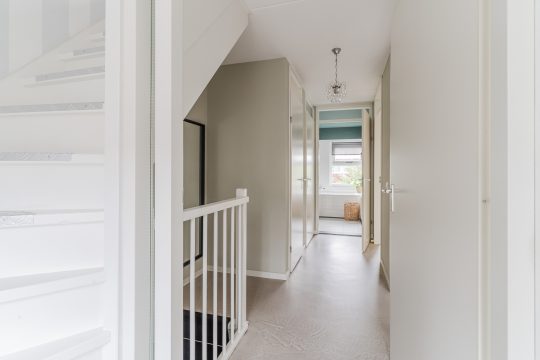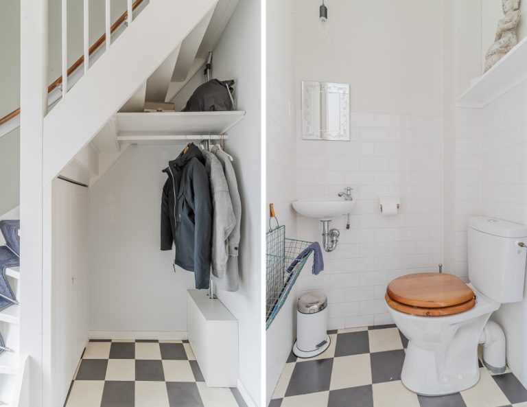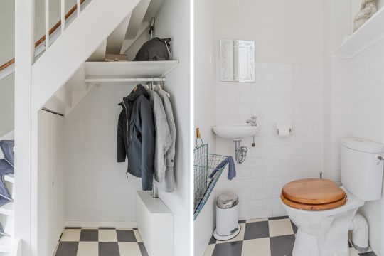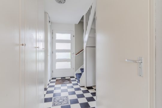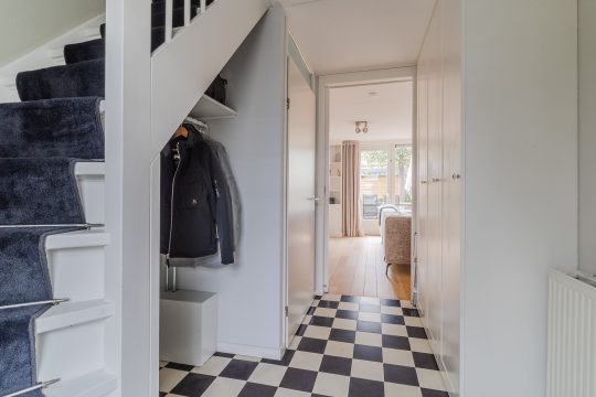 Nette entree voorzien van een tegelvloer, gedeeltelijk betegeld toilet met fonteintje, meterkast (7 groepen en 2 aardlekschakelaars), garderoberuimte onder de trap, 3-deurs kastenwand en schuifdeur met toegang tot de woonkamer.