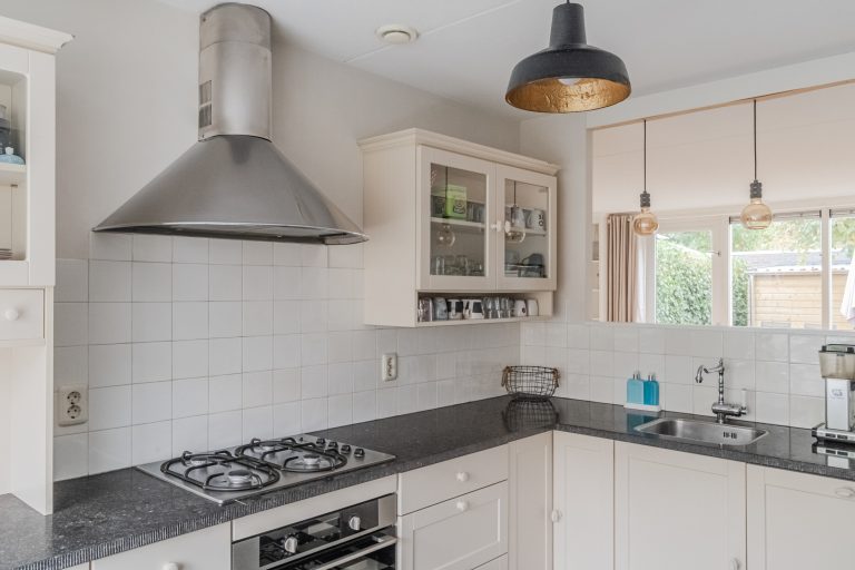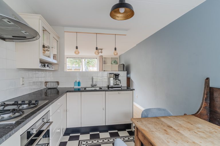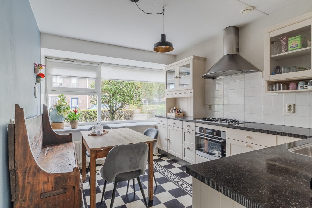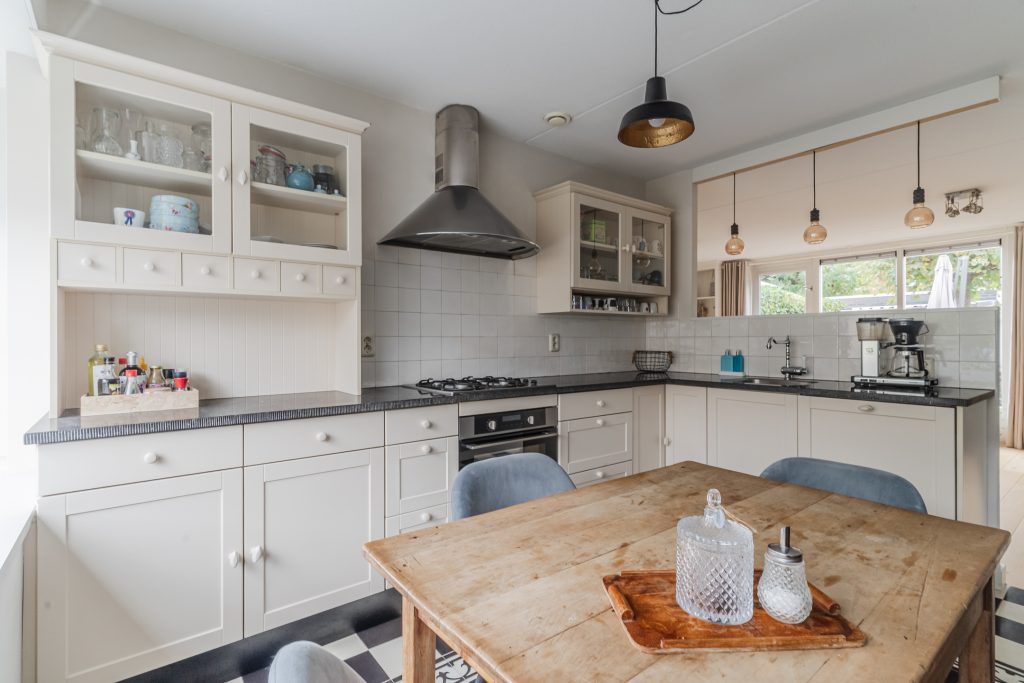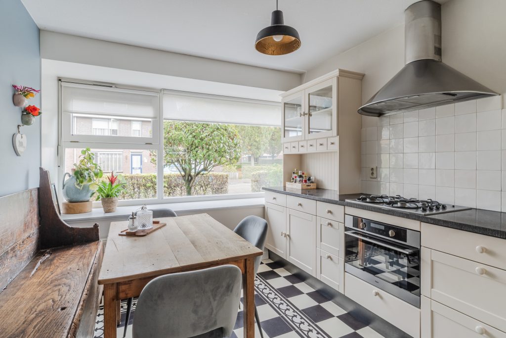 Half-open keuken aan de voorzijde van de woning met een mooie diepe vensterbank en een landelijke stijl uitgevoerde keukeninrichting in hoekopstelling met een gaskookplaat, afzuigkap, combi-oven, vaatwasser, koelkast en een robuust hardstenen aanrechtblad.