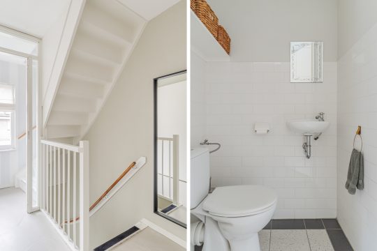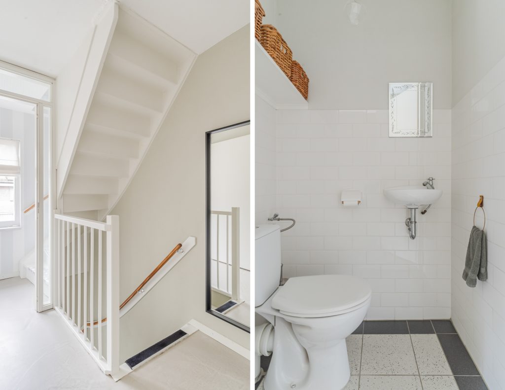 Ruime overloop met een moderne gietvloer, gedeeltelijk betegeld toilet met fonteintje, c.v.-ruimte en een afgesloten trapopgang naar de 2e verdieping.