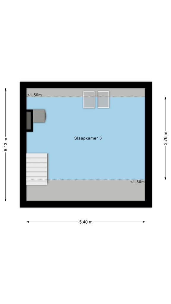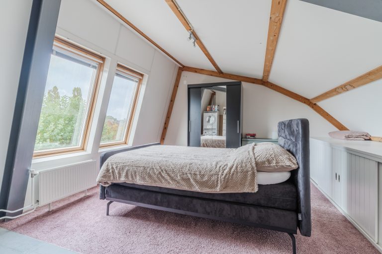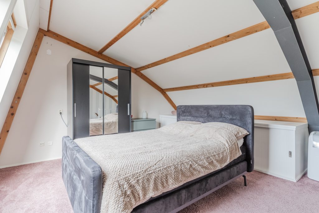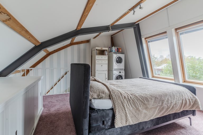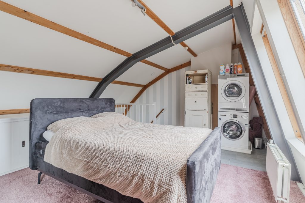 Middels een vaste trapopgang bereik je de fraaie en riante 3e slaapkamer voorzien van vloerbedekking, 2 Velux dakvensters en 4-deurs kastenwand en de wasmachine-aansluiting met daaronder een tegelvloer.