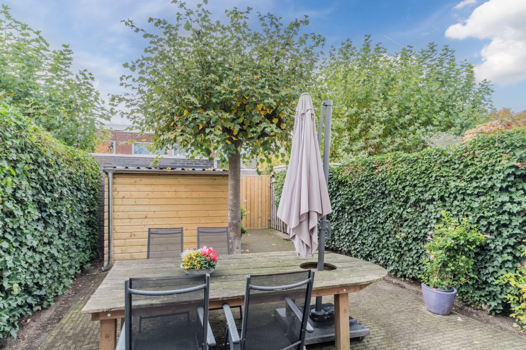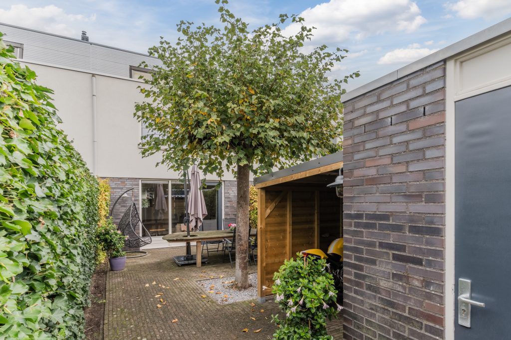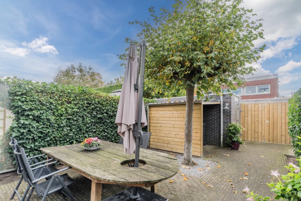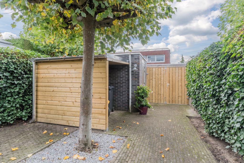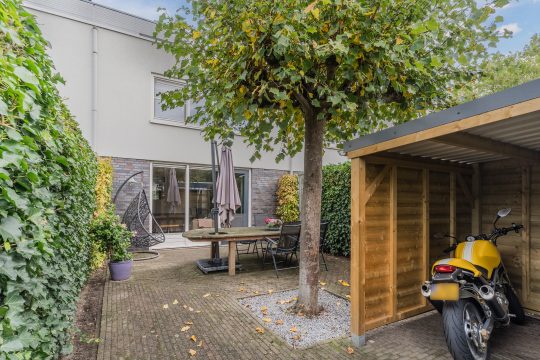 Op het zonnige zuid-westen gesitueerde achtertuin met bestrating, diverse beplanting, handige overkapping, gemetselde berging met elektra en achterom met een dubbele poort, waardoor je ook met een motor prima achterom kunt komen.