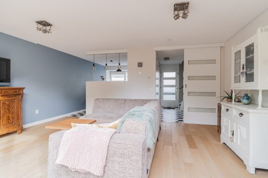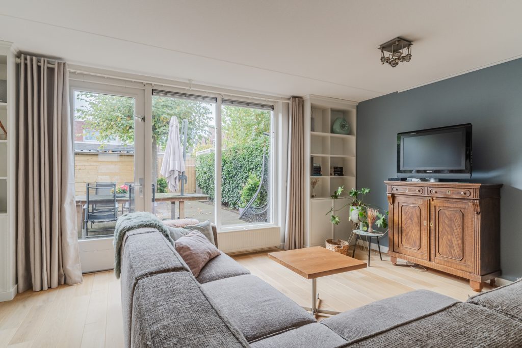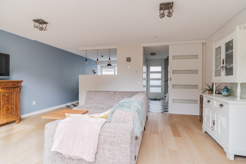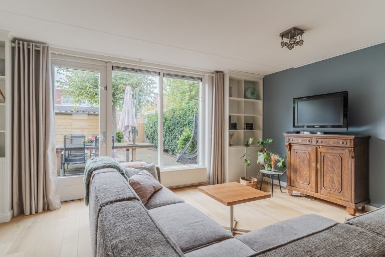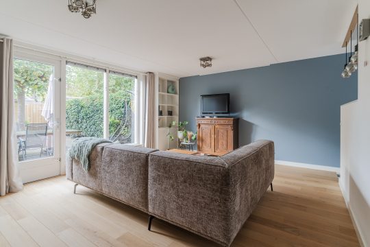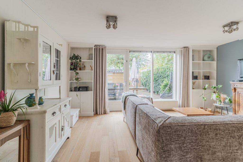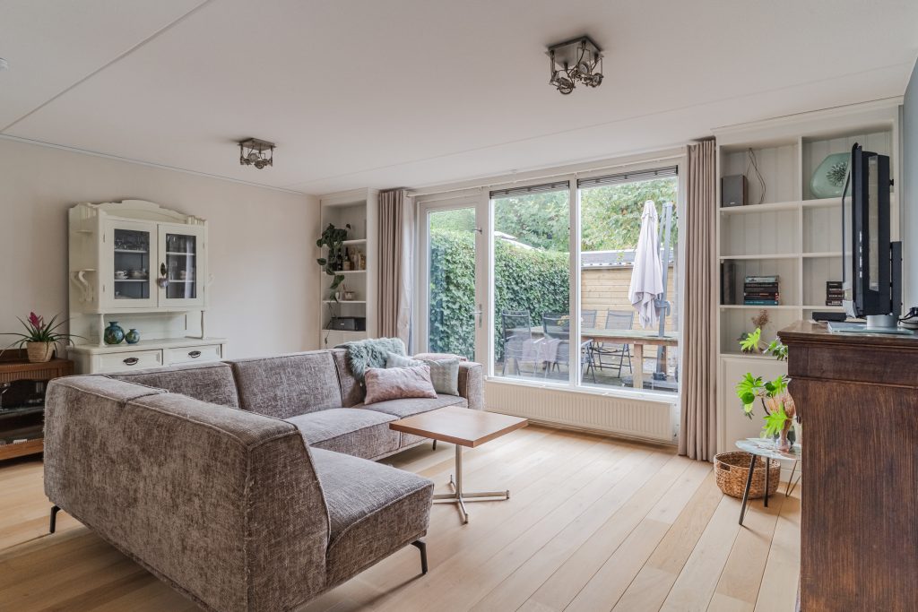 Brede woonkamer met een nette houten vloer, stucwerkwanden, spuitwerkplafond, 2 open boekenkasten en deur met toegang tot de achtertuin.