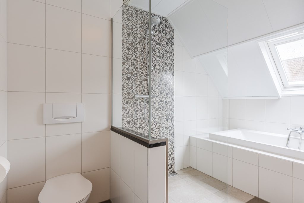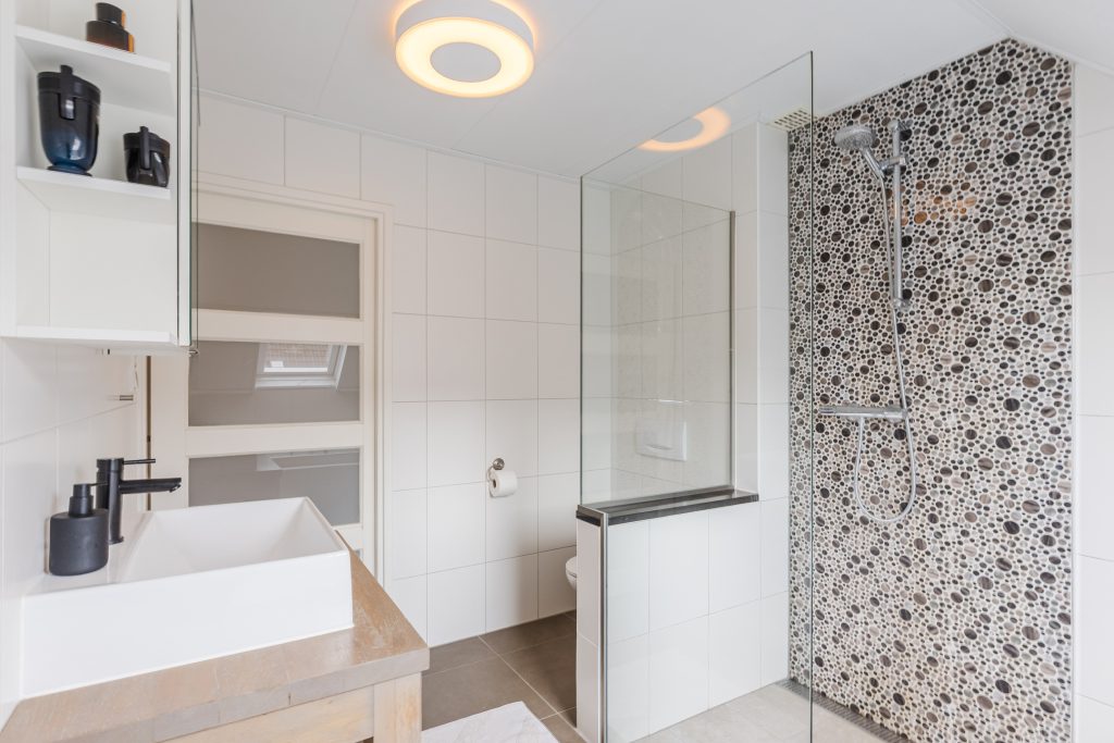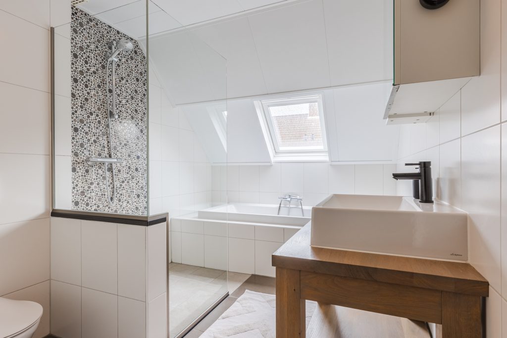 De moderne badkamer is een ware wellnessruimte! Volledig betegeld en uitgerust met een inloopdouche, ligbad, wastafelmeubel met spiegelkast, wandcloset, Velux dakvenster en vloerverwarming voor extra comfort. Hier begint en eindigt elke dag ontspannen.