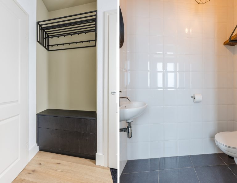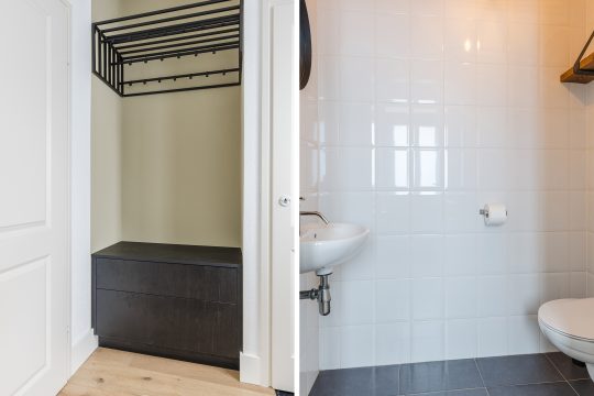 Stap binnen in de hal, voorzien van een fraaie multiplankvloer die meteen de warme en moderne sfeer van deze woning neerzet. Hier vind je een keurige, volledig betegelde toiletruimte met wandcloset en fonteintje, de vernieuwde meterkast en een praktische garderobenis.