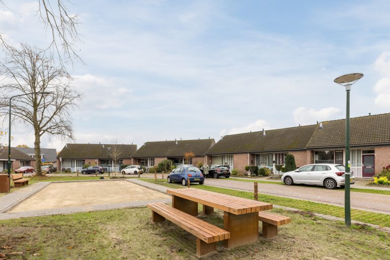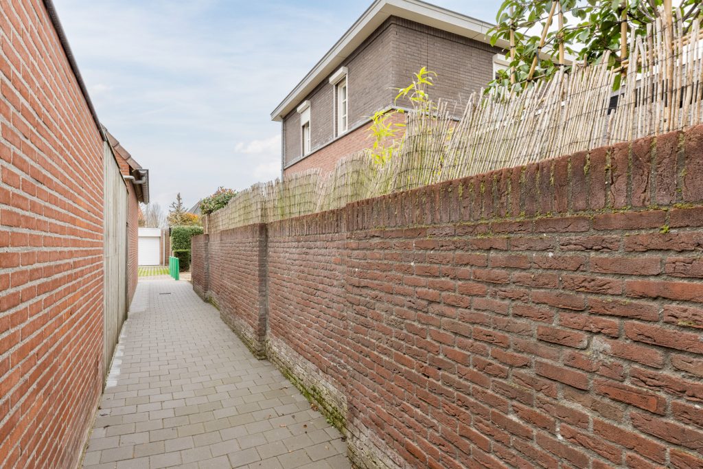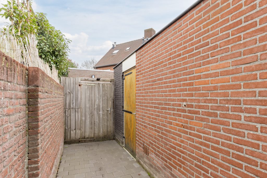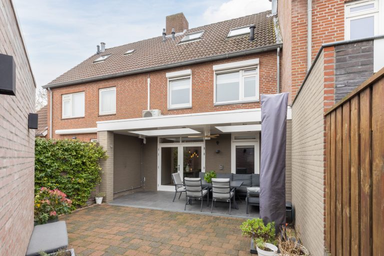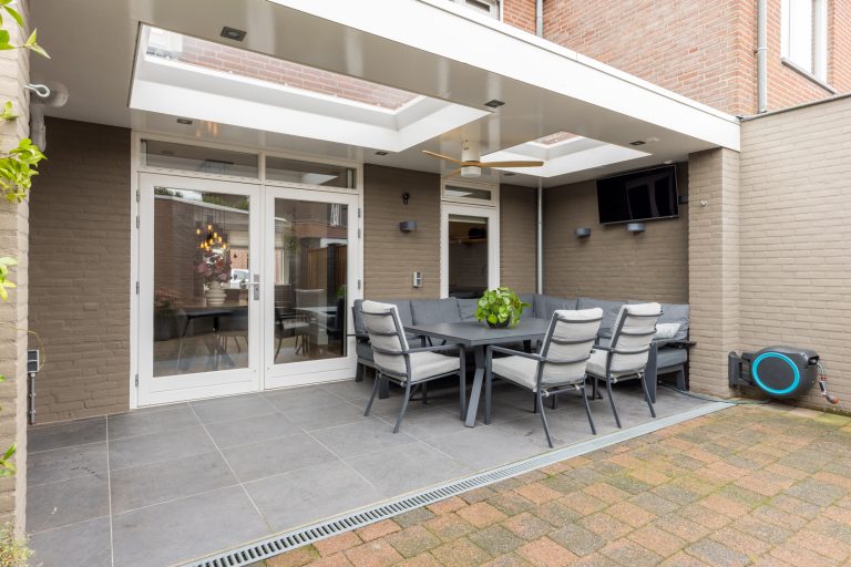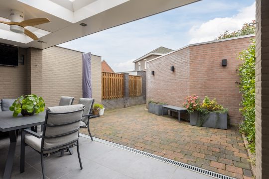 De achtertuin is onderhoudsvriendelijk aangelegd met sierbestrating en biedt dankzij de prachtige terrasoverkapping met inbouwspots en twee lichtkoepels een comfortabele plek om het hele jaar door van het buitenleven te genieten. Achterin bevindt zich een ruime, gemetselde berging met tegelvloer en elektra, terwijl een praktische achterom met poort zorgt voor extra gemak en bereikbaarheid. Hier geniet je van optimale privacy en kun je tot laat in de avond heerlijk buiten zitten.