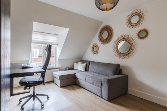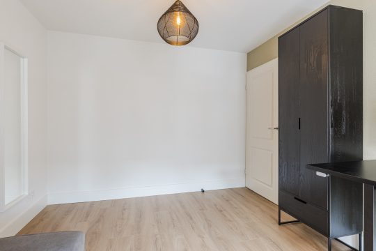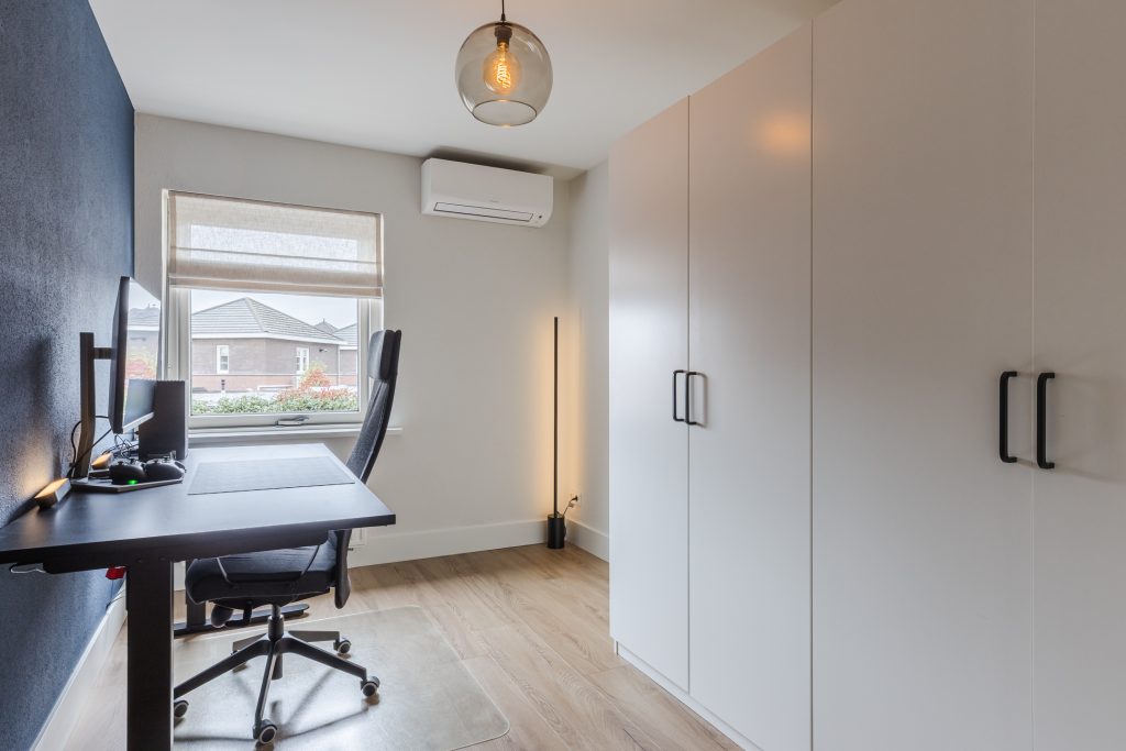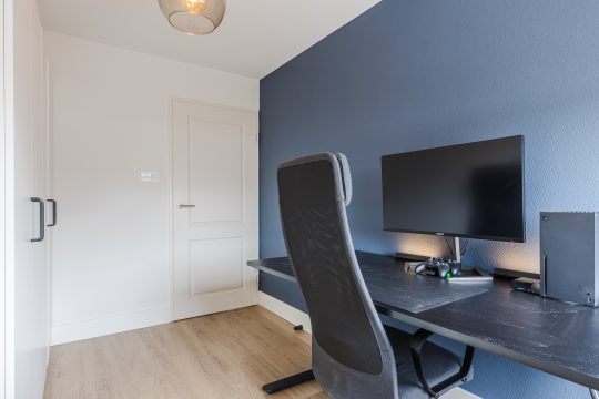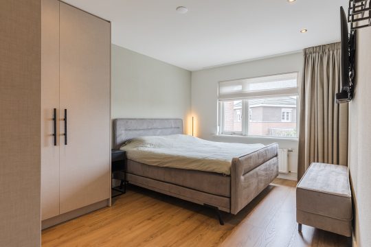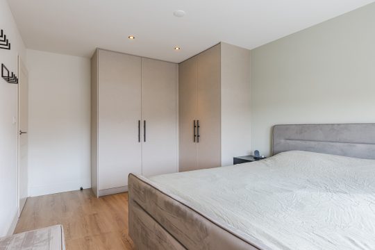 Alle drie de slaapkamers zijn smaakvol afgewerkt met een laminaatvloer, strak stucwerk en mooie plafondafwerking. De ouderslaapkamer beschikt bovendien over een royale ingebouwde kastenwand, terwijl de kleinste slaapkamer is uitgerust met airconditioning (verwarmen en koelen) – ideaal als kinderkamer, werkplek of hobbyruimte.