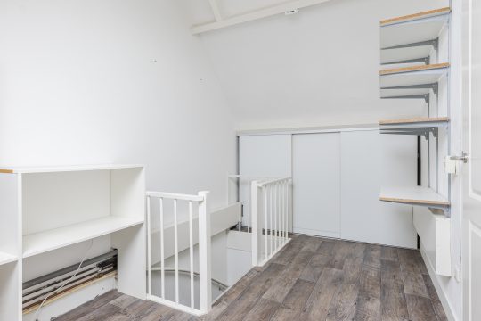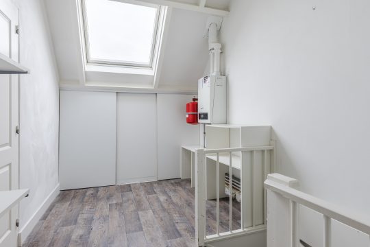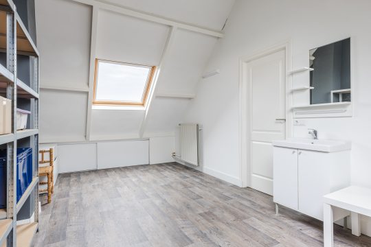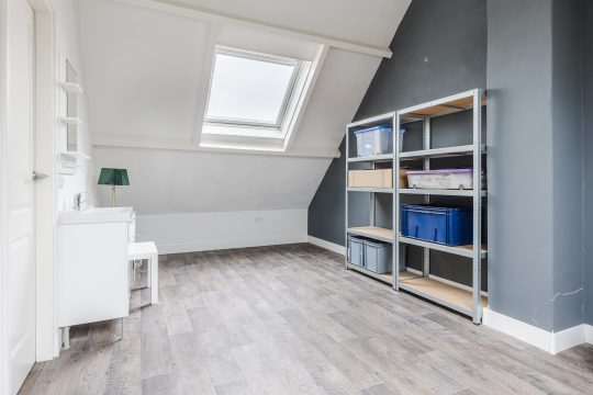 Via de vaste trap bereik je de verrassend ruime tweede verdieping. De voorzolder is praktisch ingericht met een vinylvloer, extra bergruimte onder de dakschuinte, een Velux dakvenster, de opstelling van de c.v.-installatie en de wasmachineaansluiting.