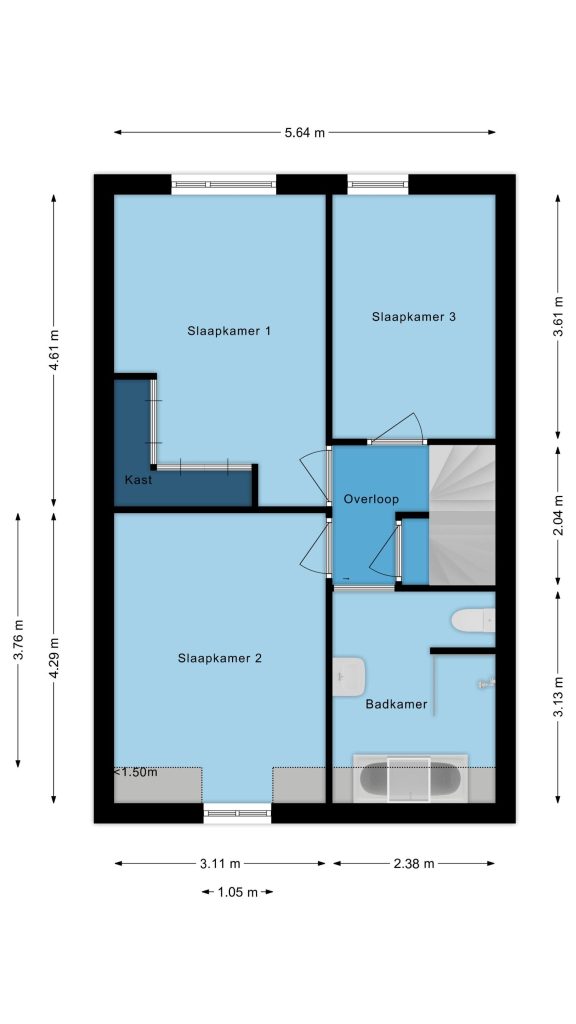 Op de eerste verdieping word je verwelkomd op de overloop met laminaatvloer, die toegang biedt tot drie verrassend ruime slaapkamers en de badkamer.