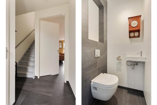 Entreehal met tegelvloer, halfhoog betegelde toiletruimte met wandcloset en fonteintje, uitgebreide meterkast (voorzien van 10 groepen, kookgroep, krachtgroep en 3 aardlekschakelaars), toegang tot de woonkamer en trapopgang naar de 1e verdieping.