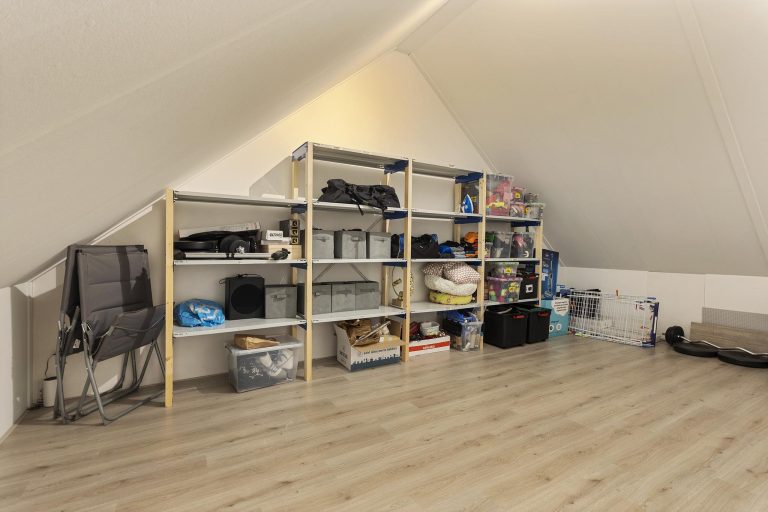 Middels een vaste trap bereikbare grote zolderkamer met laminaatvloer, wasmachine-aansluiting, mechanische ventilatie unit en bergruimte aan beide zijden onder dakschuinte. Door het plaatsen van een dakraam kan hier eenvoudig een grote slaapkamer worden gerealiseerd en wordt de gebruiksoppervlakte wonen met maar liefst 25 m² vergroot!