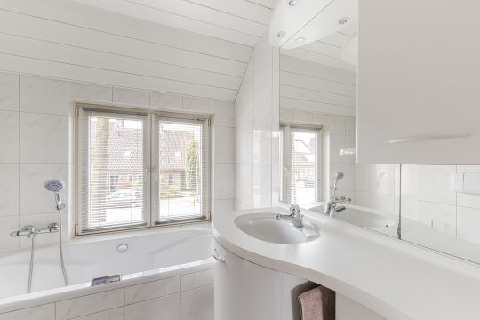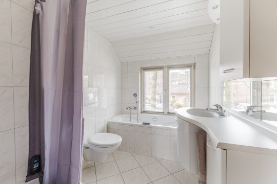 De badkamer is volledig betegeld en ingericht als een complete en ontspannen wellnessruimte met een ligbad, aparte douche, wandcloset, wastafelmeubel en een designradiator. Het aluminium plafond met inbouwspots geeft het geheel een strakke afwerking.