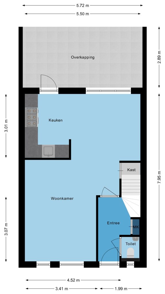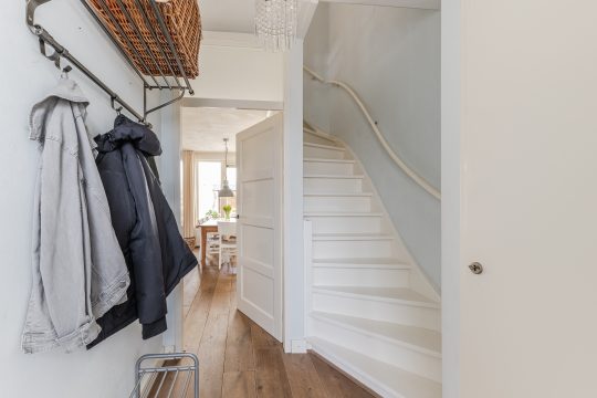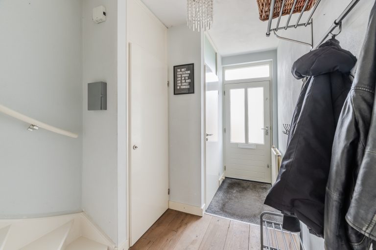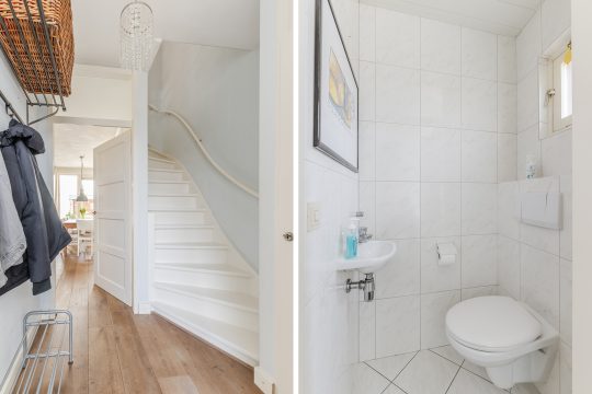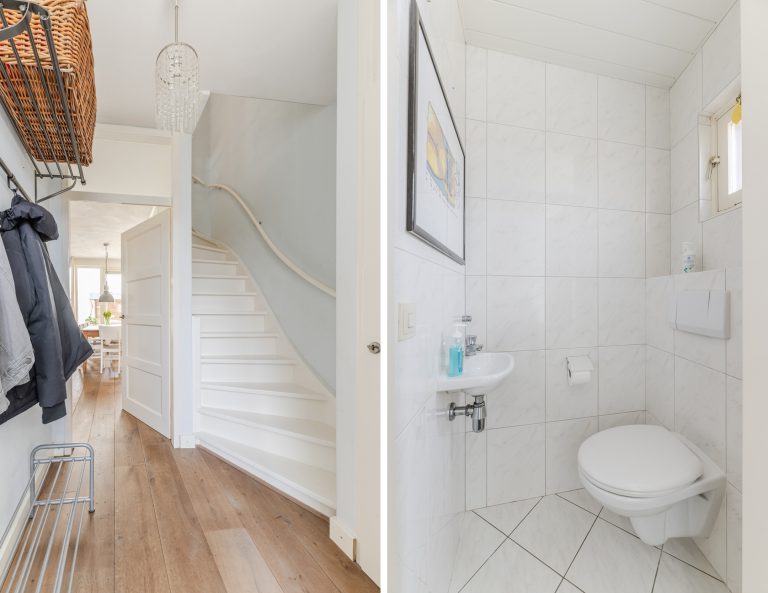 Je komt binnen in een verzorgde hal met een warme eikenhouten vloer die direct een stijlvolle eerste indruk geeft. Hier vind je de meterkast, de trapopgang naar boven en een modern afgewerkte, volledig betegelde toiletruimte met wandcloset en fonteintje.