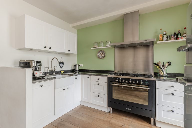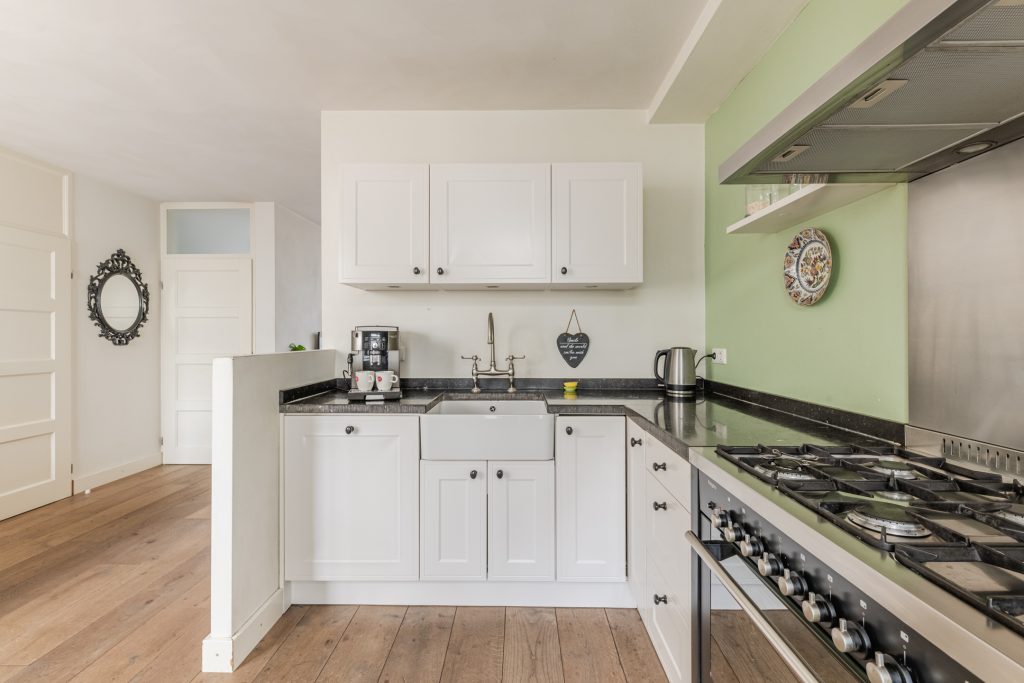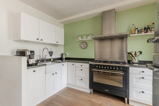 Aan de achterzijde sluit de woonkamer naadloos aan op de open keuken, waardoor je een heerlijke leefruimte ervaart waar koken en samenzijn moeiteloos in elkaar overlopen. De landelijke keuken in hoekopstelling is compleet uitgerust met een fornuis met zes gaspitten en een royale oven, een afzuigkap, vaatwasser, losse koel-vriescombinatie en een stijlvol hardstenen aanrechtblad. Via de keukendeur stap je zo de achtertuin in, waar de terrasoverkapping ervoor zorgt dat je al vroeg in het jaar en tot laat in het seizoen buiten kunt genieten.