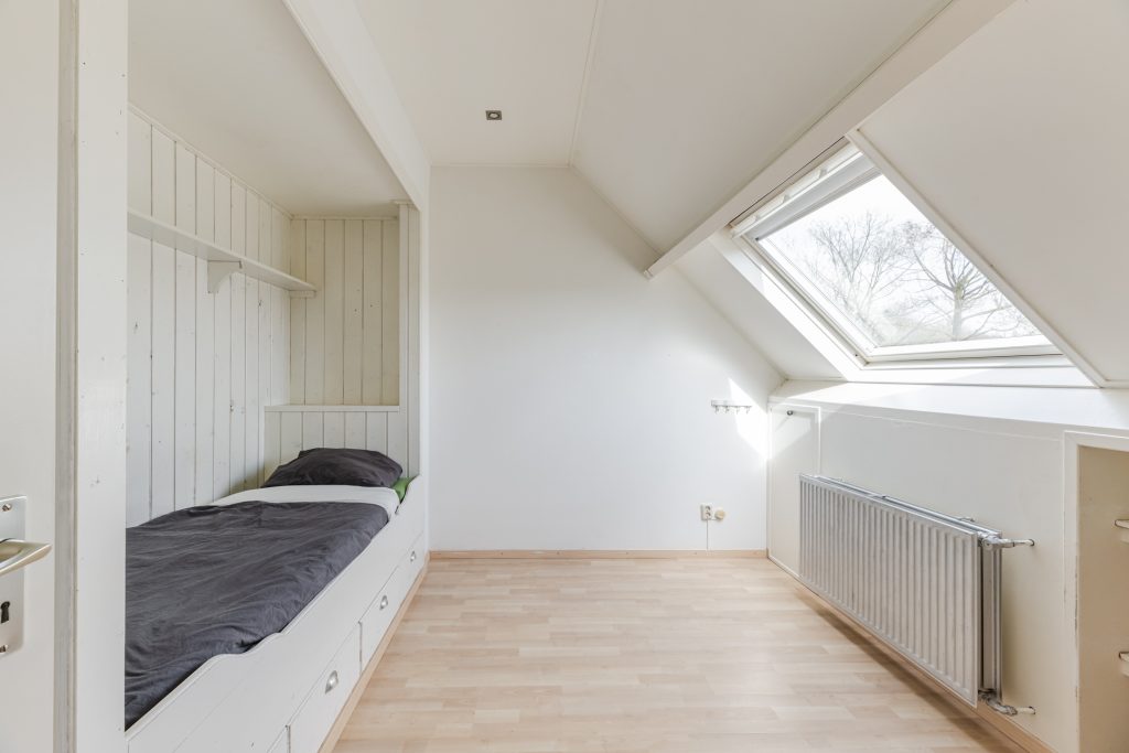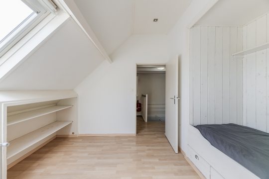 De grote vierde slaapkamer is een echte blikvanger en biedt een speelse en warme uitstraling dankzij de op maat gemaakte bedstee, het Velux dakvenster dat zorgt voor prettig daglicht en extra bergruimte onder het schuine dak.