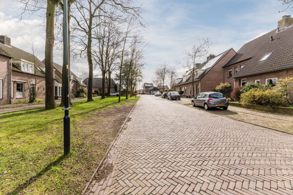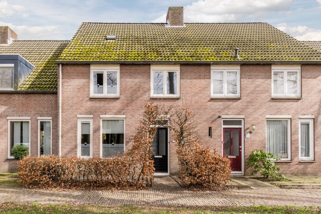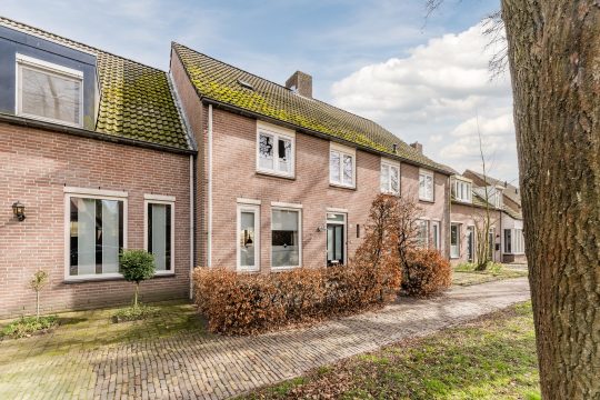 Aan de voorzijde geeft de compacte voortuin met beukenhaag en verzorgde bestrating de woning een nette en uitnodigende uitstraling.