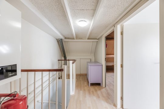 Via de vaste trap bereik je de verrassend ruime bovenste woonlaag. Op de voorzolder vind je de opstelling van de c.v.-installatie, de aansluiting voor je wasmachine en handige bergruimte onder de dakschuinte.