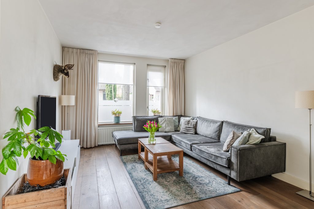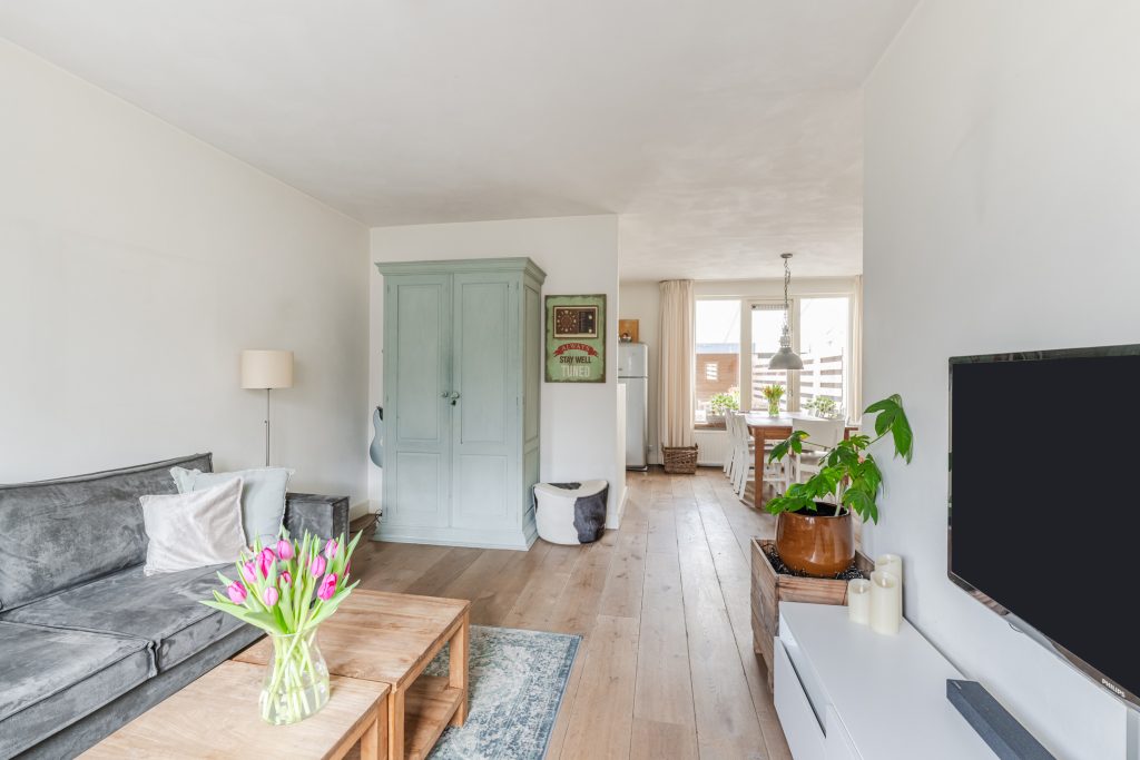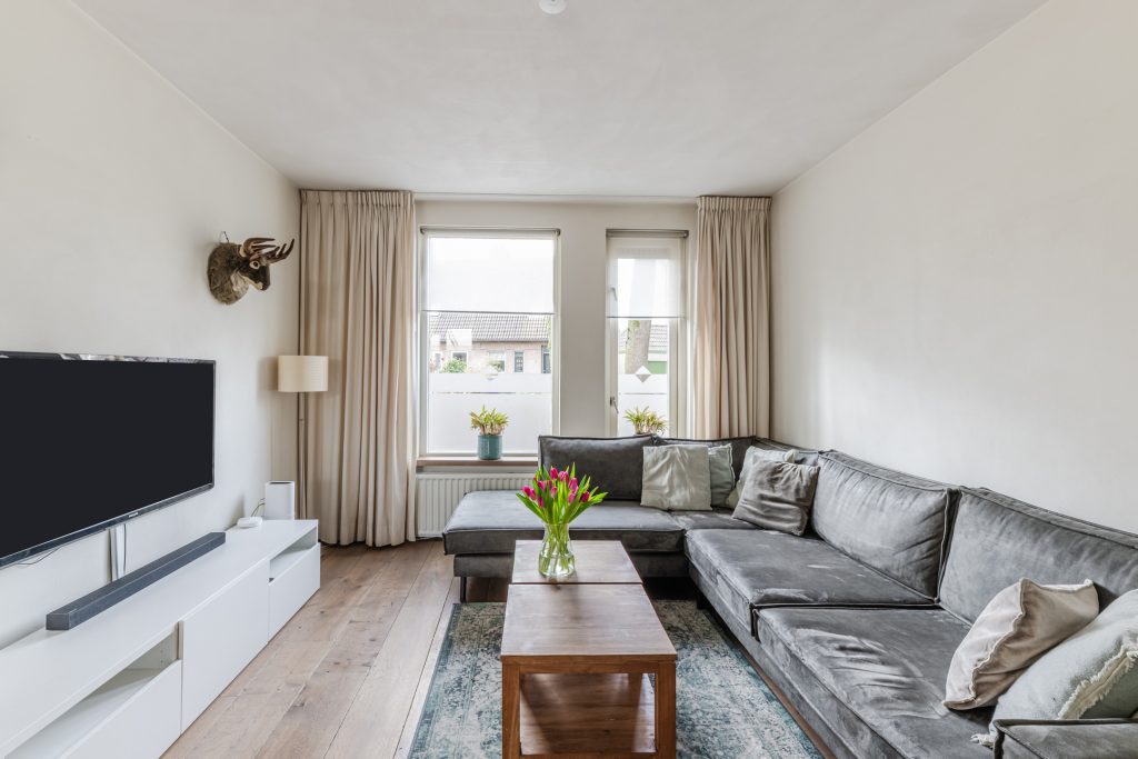 Vanuit de hal loop je door naar de sfeervolle Z-vormige woonkamer waar het daglicht rijkelijk naar binnen valt door de grote raampartijen. De combinatie van de eikenhouten vloer, gestucte wanden en -plafond en de praktische trapkast zorgt voor een ruimte die zowel knus als functioneel aanvoelt.