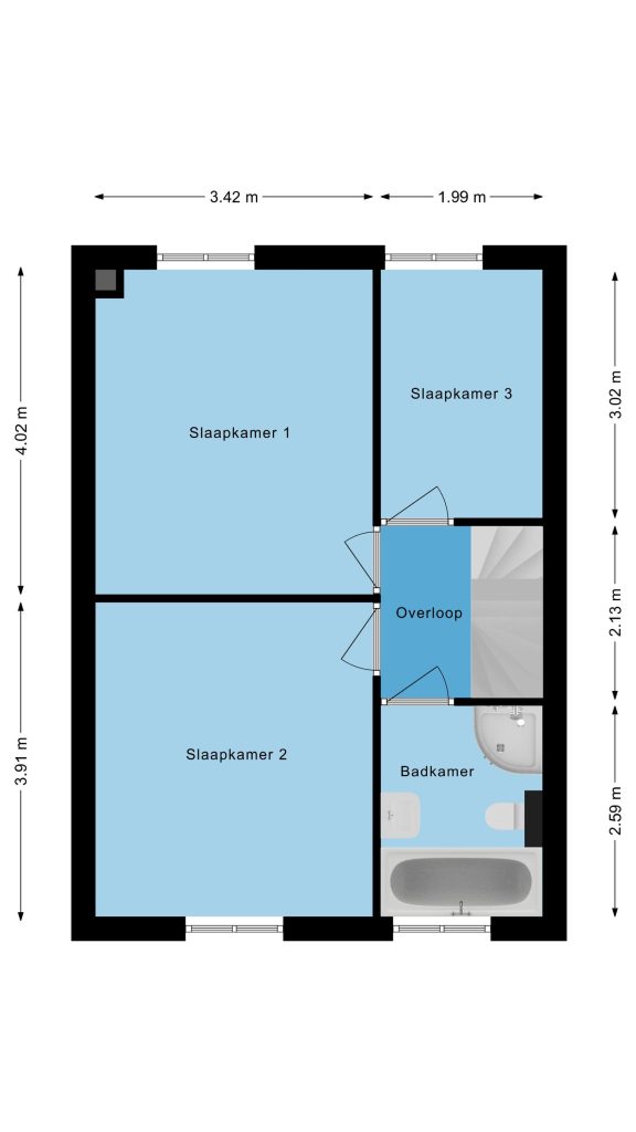 Op de overloop geeft de laminaatvloer een nette en moderne uitstraling en heb je toegang tot drie comfortabele slaapkamers en de badkamer. Ook vind je hier de vaste trap naar de tweede verdieping.