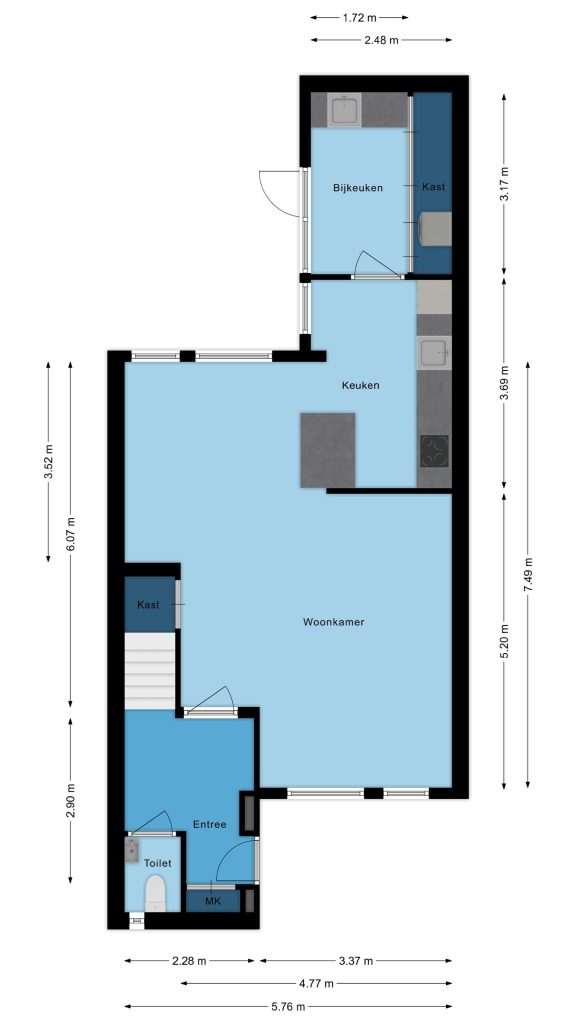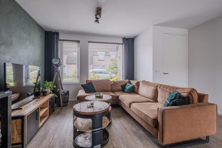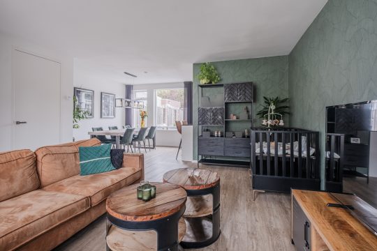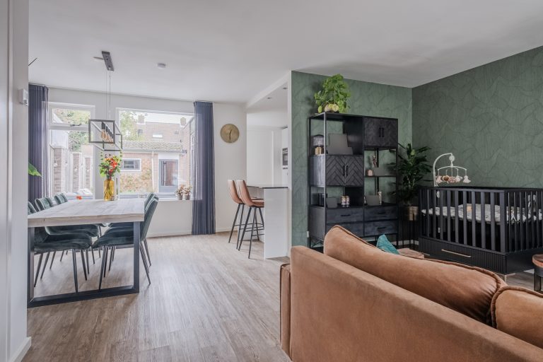 Bij binnenkomst van het woongedeelte voelt het gelijk goed! Je wordt verrast door de royale ruimte, de vele raampartijen en de moderne afwerking. De woonkamer is opgedeeld in een gezellige zit- en eethoek. De zithoek aan de voorzijde is erg ruim van opzet waardoor hier een grote hoekbank zeker niet misstaat. Het eetgedeelte staat in open verbinding met luxe maatwerk keuken. Tevens is er een praktische trapkast aanwezig voor het bergen van spullen.