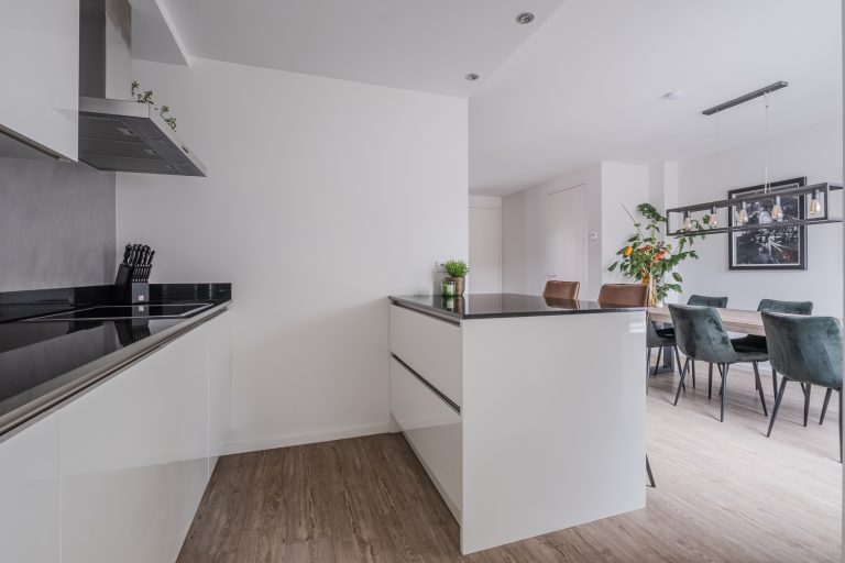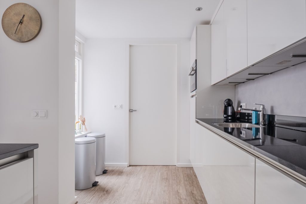 De hoogwaardige afwerking gaat maar door! Aangrenzend vind je de bijkeuken, voorzien van maatwerk kasten en extra werkruimte – praktisch én strak afgewerkt. In de maatwerk kast tref je het witgoed op hoogte, een grote diepvries en spoelbak met warm en koud water.