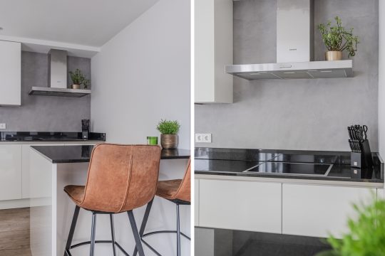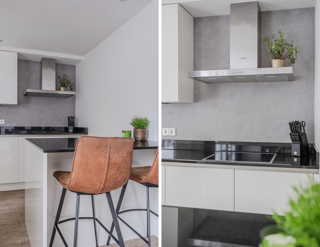 De open keuken is een echte eyecatcher: luxe uitgevoerd met hoogwaardige apparatuur (Siemens), veel kastruimte, een stijlvol composieten werkblad en een praktische betonstuc achterwand. De keuken is in een ruime wandopstelling geplaatst met een schiereiland waar een ontbijtbar is gecreëerd. Alle apparatuur zoals een inductie kookplaat, afzuigkap, vaatwasser, koelkast en combi-oven zijn aanwezig. Koken wordt hier elke dag een feestje.