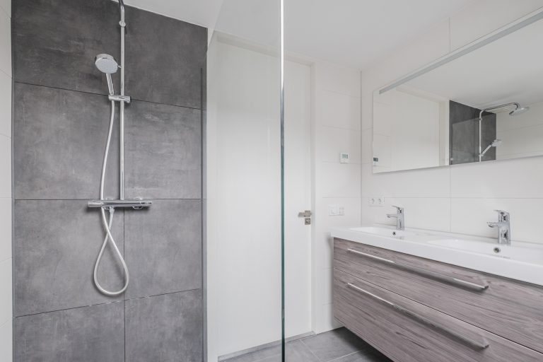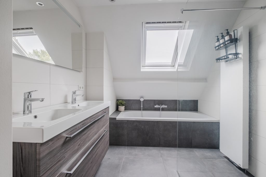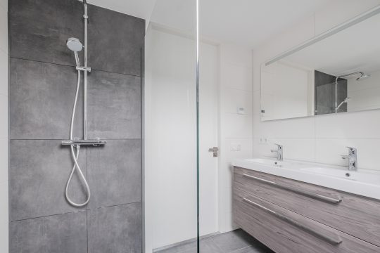 De badkamer straalt pure luxe uit: een ruime inloopdouche met hand- en regendouche, stijlvolle tegels, een groot ligbad en een badmeubel met 2 wastafels zorgen voor een echte spa-beleving. Dankzij de designradiator en de vloerverwarming (aparte thermosstaat) is het hier altijd comfortabel. Tevens is er zowel mechanische ventilatie als natuurlijke ventilatie aanwezig.
