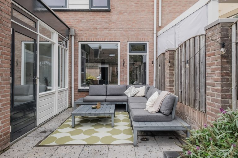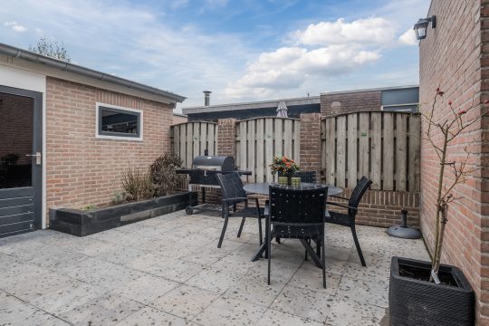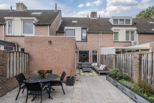 De onderhoudsvriendelijke achtertuin is een fijne plek om te ontspannen. De strakke bestrating en de plantenborders met vaste beplanting maken het een modern en onderhoudsvriendelijk geheel. Aan de achterzijde tref je een praktische stenen berging met eigen achterom, elektra en geïsoleerd dak.