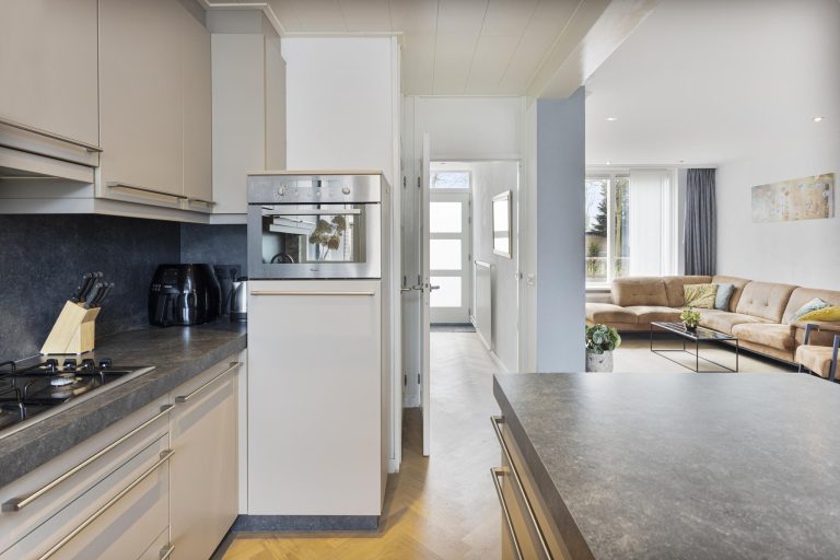 Open keuken met eikenhouten vloer in visgraatmotief, MDF-plafond met inbouwspots, praktische trapkast, toegang tot het overdekt terras en een moderne 2-delige keukeninrichting voorzien van een gaskookplaat, afzuigkap, combi-oven, koelkast en vaatwasser.