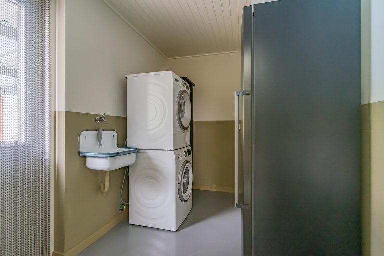 Via keuken te bereiken praktische bijkeuken met toegang tot de inpandige garage en middels loopdeur naar de achtertuin. Tevens is er ruimte voor een koelvriescombinatie en zijn hier de witgoedaansluitingen geplaatst.