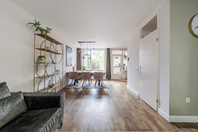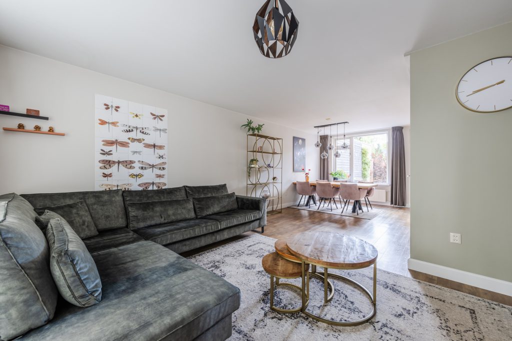 De zeer ruime woonkamer, waar de erker aan de voorzijde en het extra zijraam zorgen voor een prachtige lichtinval. De kamer is afgewerkt met een houtlook pvc vloer, strakke stucwerk wanden en een stucwerk plafond, wat samen een moderne en frisse uitstraling geeft. Extra fijn is de praktische hoek, ideaal in te richten als speelkamer of thuiswerkplek. Een grote hoekbank en een fijne 6 -persoons eettafel misstaan hier zeker niet!