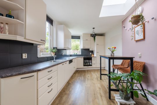De aangebouwde keuken is voorzien van een lichtkoepel en meerdere raampartijen met uitzicht over de tuin, waardoor koken hier altijd in een lichte en prettige omgeving gebeurt. De zeer ruime, keurige in hoekopstelling geplaatste keukeninrichting is voorzien van een oven, vaatwasser, gasfornuis, afzuigkap en spoelbak met close-in boiler. De aanbouw is eveneens afgewerkt met dezelfde strakke PVC vloer met vloerverwarming.