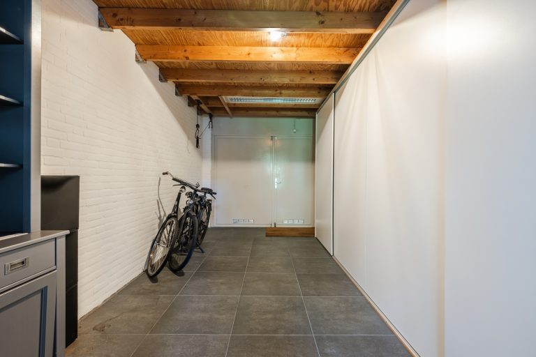 Aansluitend bevindt zich een portaal met de luxe toiletruimte (2021), een bergkast en de doorgang naar de riante garage met eveneens een bergkast: volop bergruimte dus! De garage is eveneens goed afgewerkt met een chique tegelvloer en voorzien van openslaande deuren naar de oprit, de meterkast, verwarming, elektra en verwarming.