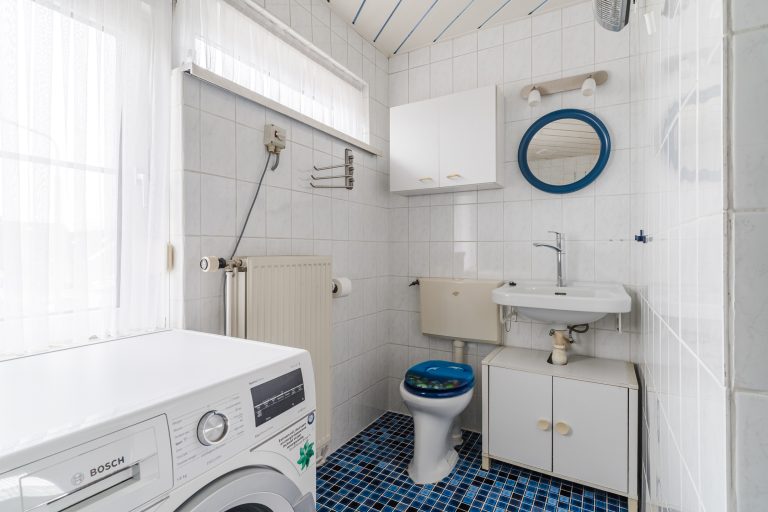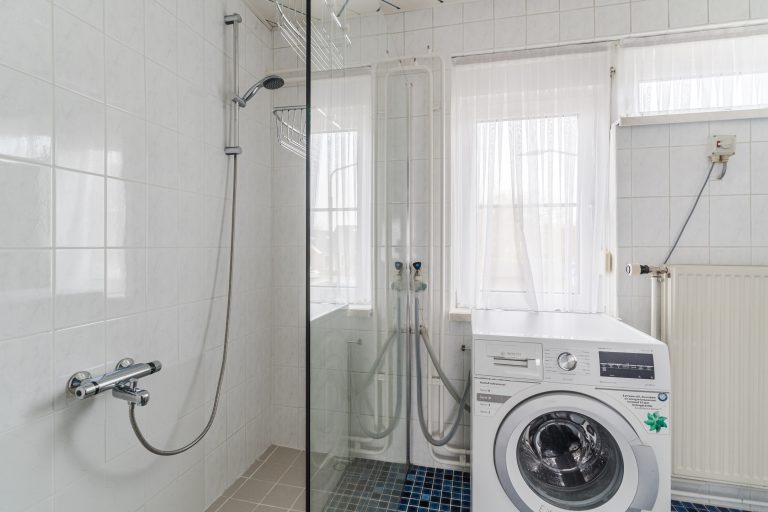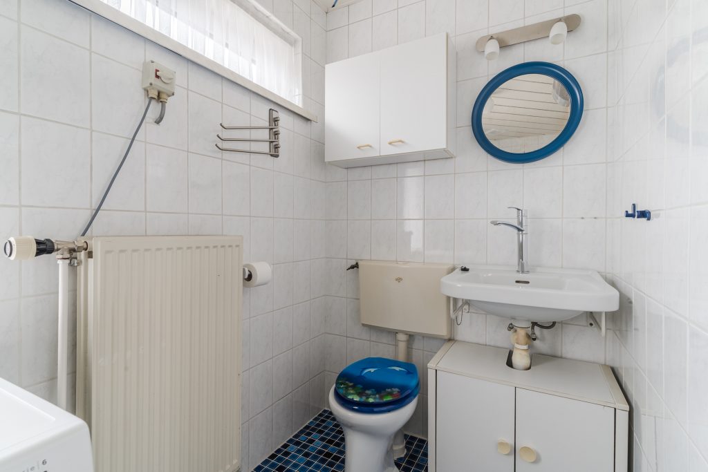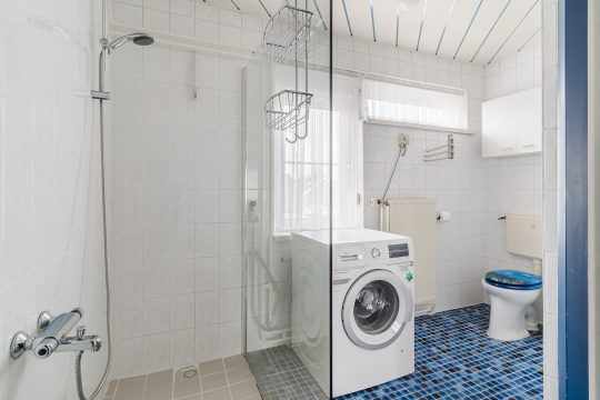 De volledig betegelde badkamer is compleet ingericht met een inloopdouche, toilet, wastafel en een aansluiting voor de wasmachine.