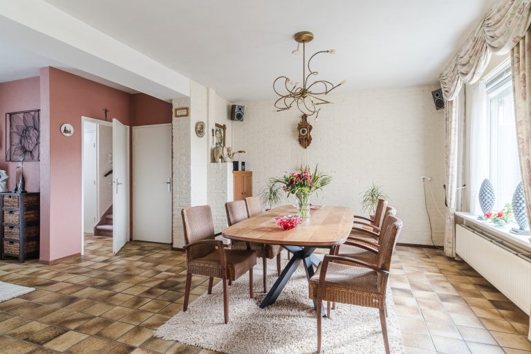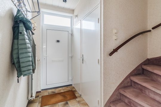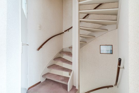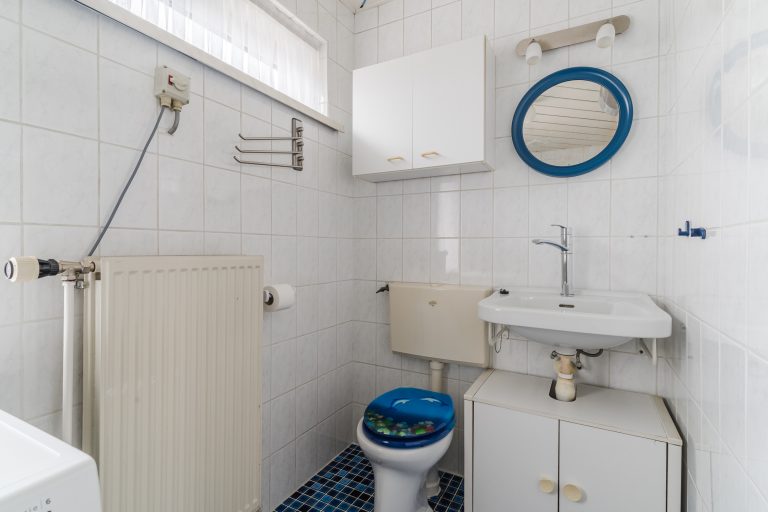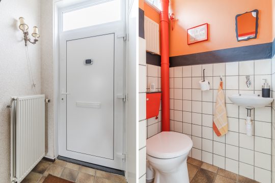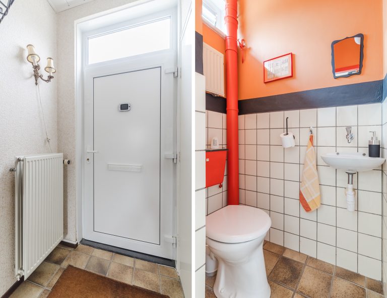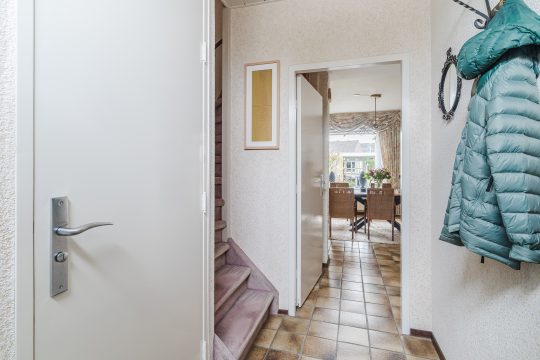 Bij binnenkomst kom je in de hal met een nette tegelvloer, een vernieuwde meterkast en een gedeeltelijk betegeld toilet met fonteintje. Vanuit hier heb je toegang tot de woonkamer en de trap naar de eerste verdieping.