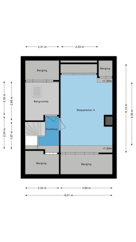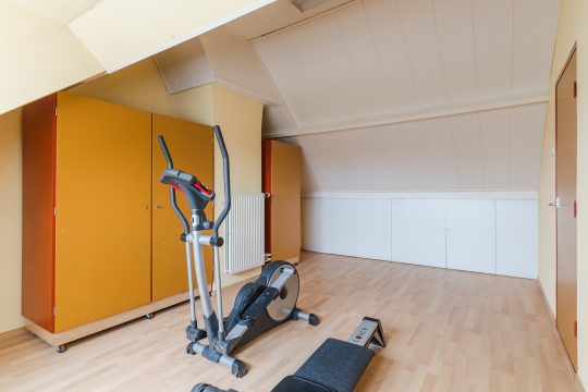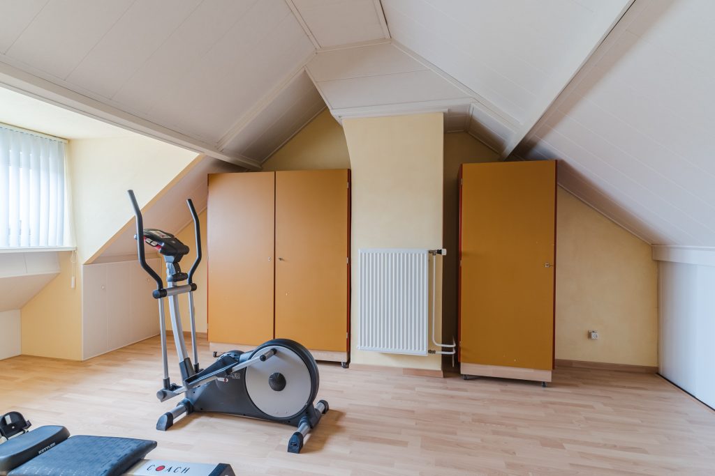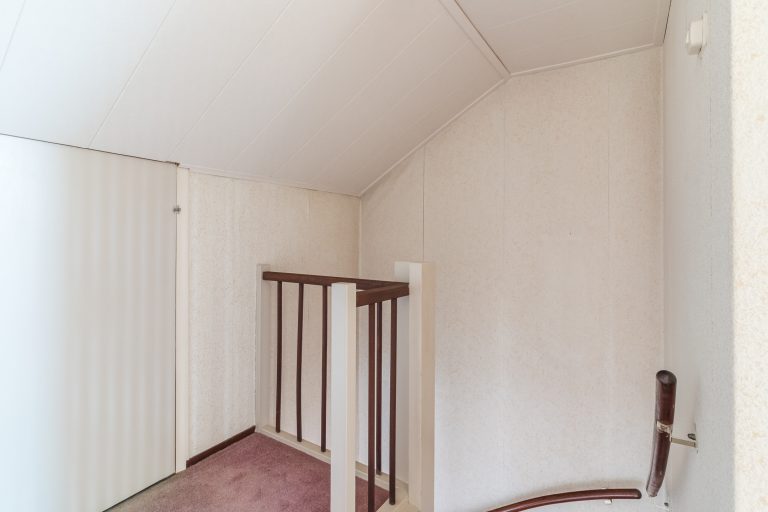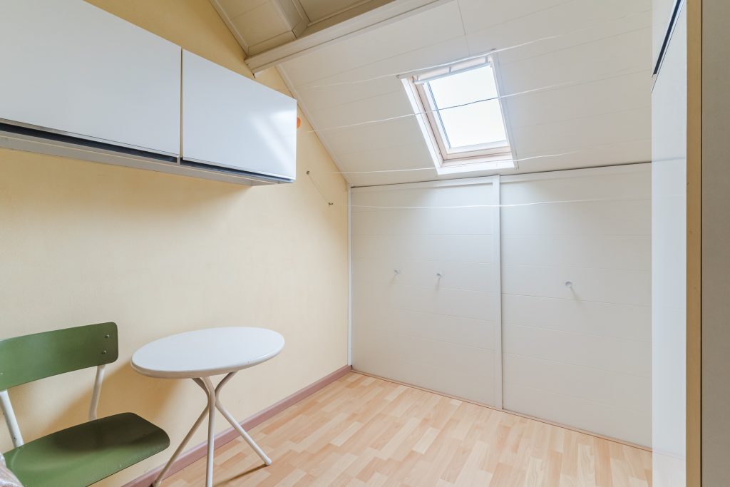 Via een vaste trap bereik je de tweede verdieping. Hier vind je een voorzolder met vloerbedekking en handige bergruimte onder de schuine kanten van het dak. Aansluitend is er een riante berging met laminaatvloer, veel opbergmogelijkheden en een Velux dakvenster voor natuurlijk licht.
