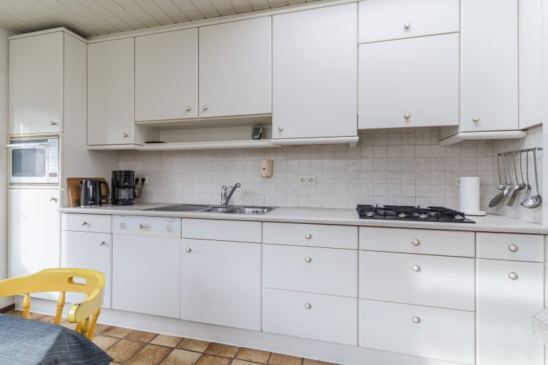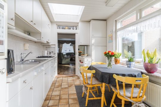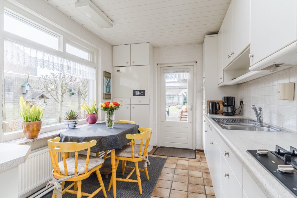 Aan de achterzijde bevindt zich de uitgebouwde keuken, voorzien van een tegelvloer, een lichtkoepel en een deur naar de tuin. De keuken is uitgevoerd in een nette wandopstelling en uitgerust met een gaskookplaat, afzuigkap, vaatwasser, koel-/vriescombinatie en combi-magnetron. Ook is hier de opstelling van de cv-installatie aanwezig.