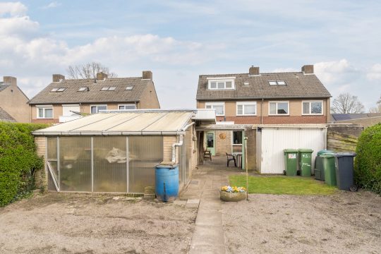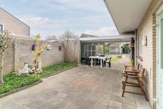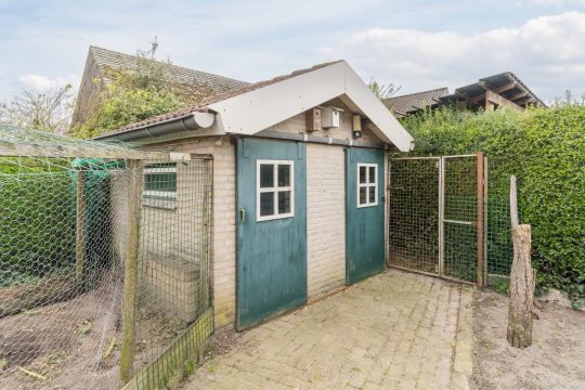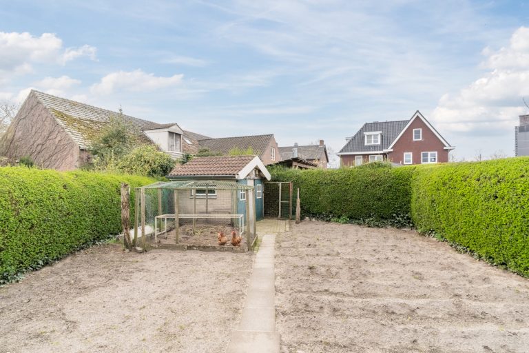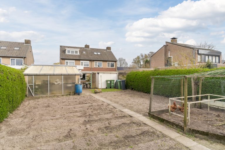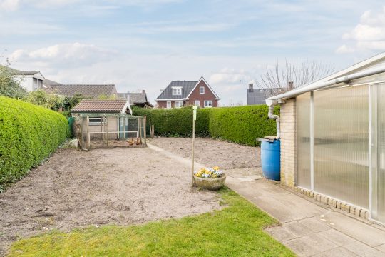 De achtertuin is een absolute eyecatcher: gelegen op het zonnige westen, meer dan 30 meter diep en met volop privacy. Je vindt hier een fijne combinatie van bestrating, gazon en diverse beplanting. Daarnaast beschikt de tuin over een gemetselde berging met kippenren, een hobbykas en een praktische achterom met schuifpoort die toegang geeft tot de oprit en carport.