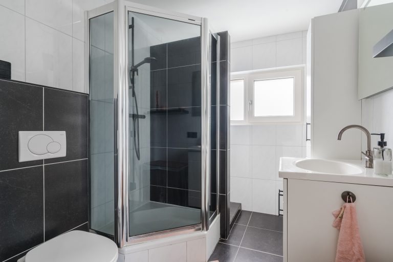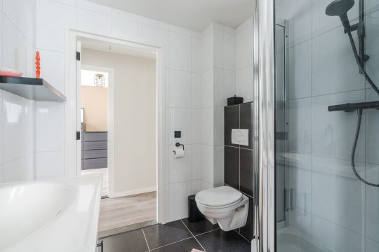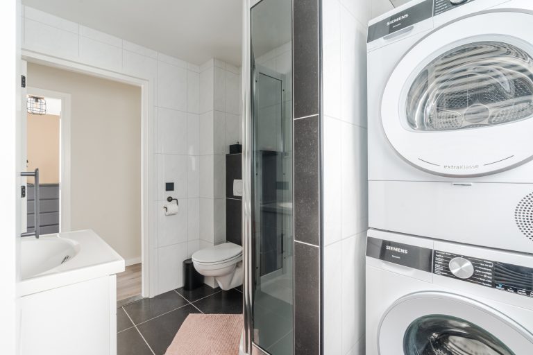 Volledig in neutrale kleurstelling betegelde badkamer voorzien van een douchecabine, badmeubel met wastafel en wandkast, wandcloset, designradiator en een nis met daarin aansluitmogelijkheid voor wasmachine en -droger.