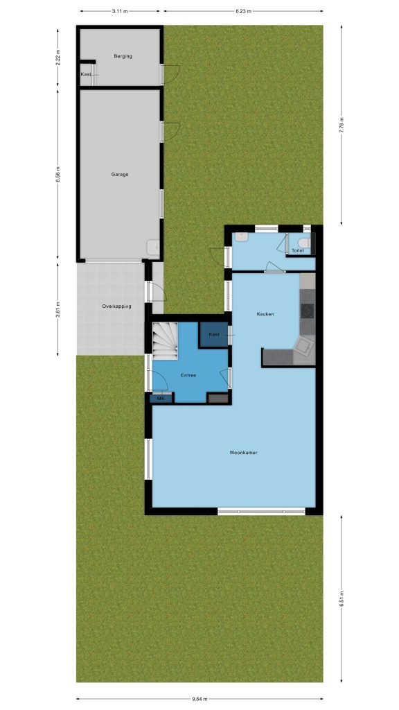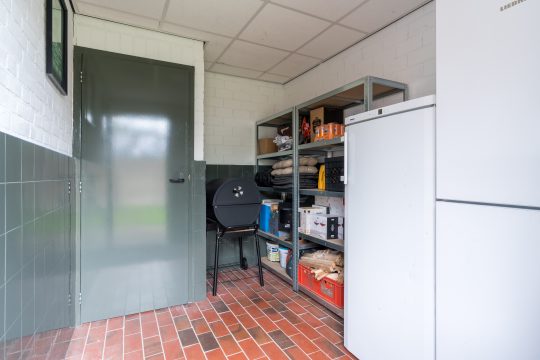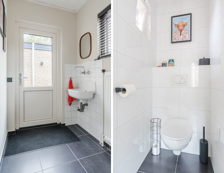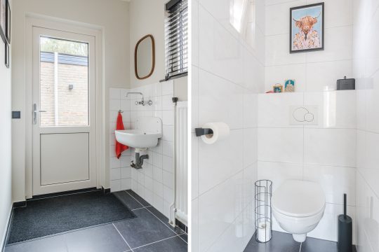 Portaal aan de achterzijde van de woning met toegang tot de achtertuin, uitstortgootsteen en een volledig betegelde toiletruimte met wandcloset.