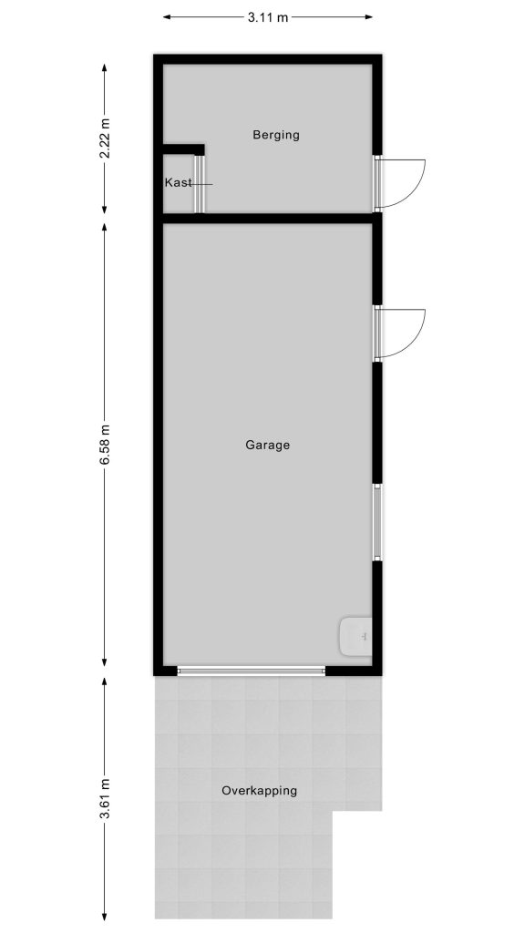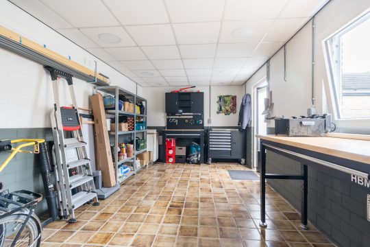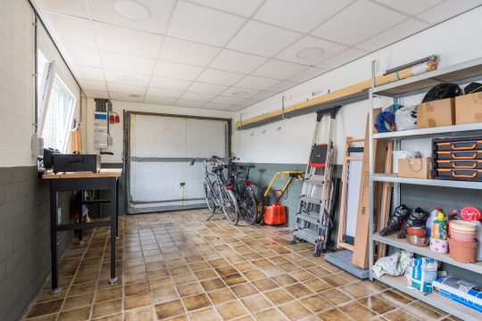 In spouwmuren gemetselde garage met een tegelvloer, wastafel, krachtstroom en stalen kanteldeur met toegang tot de oprit en carport. Aan de achterzijde is een berging aan de garage gebouwd welke is voorzien van een inbouwkast.