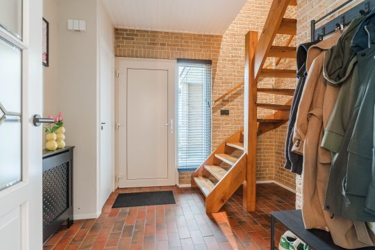 Ruime entree voorzien van een tegelvloer, in 2024 vernieuwde meterkast (11 groepen, 3 aardlekschakelaars, krachtstroom en 1 kookgroep), toegang tot de woonkamer en trapopgang naar de 1e verdieping.