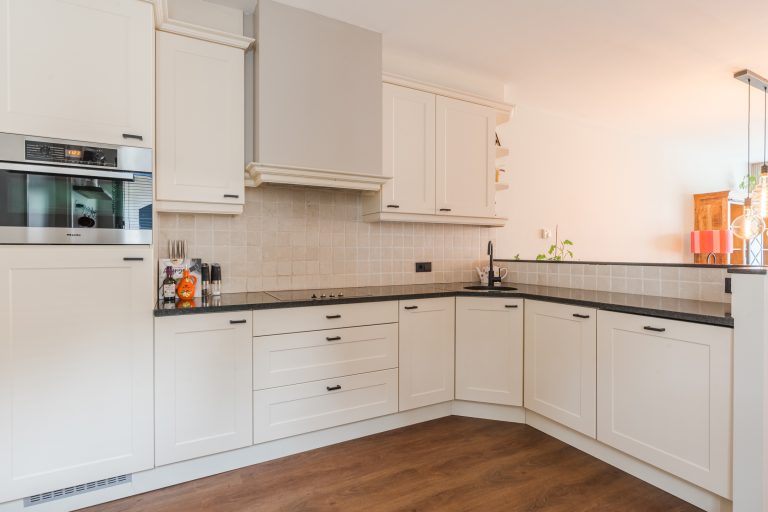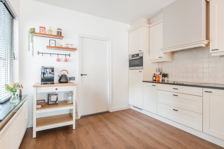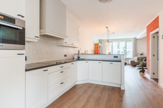 Open keuken met een PVC-vloer, handige kelderkast en een nette keukeninrichting in hoekopstelling voorzien van een keramische kookplaat, afzuigkap, oven, vaatwasser en koelkast.