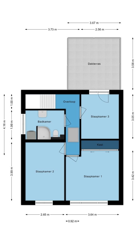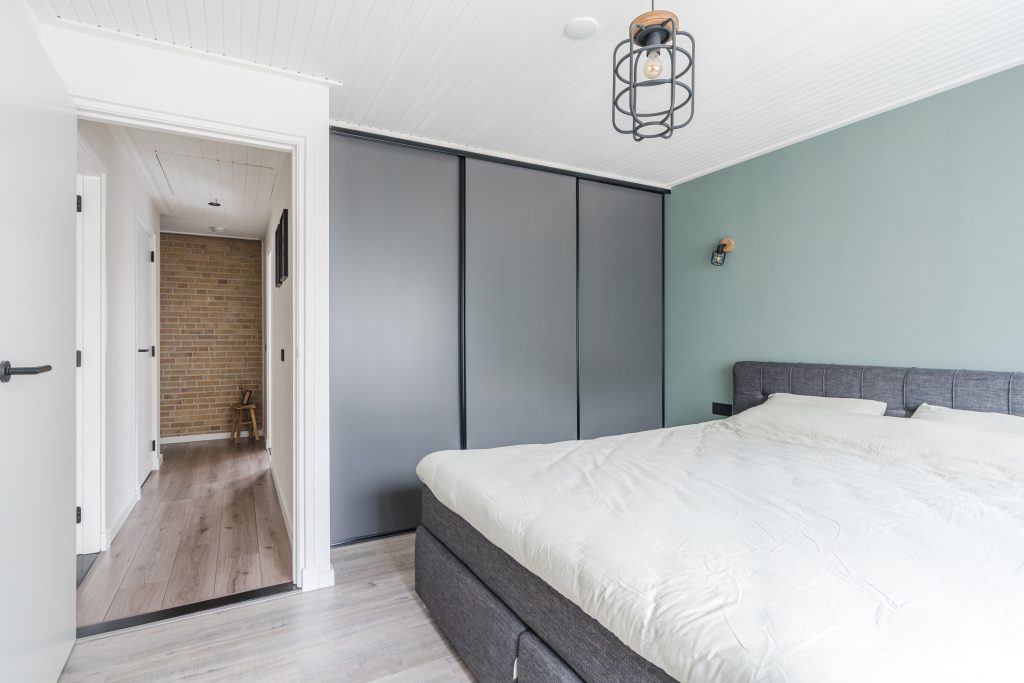 De drie ruime slaapkamers zijn allen voorzien van een laminaatvloer, stucwerk- of behangwanden en een met lichte schroten betimmerd plafond. In de ouderslaapkamer is een 3-deurs kastenwand aanwezig en de slaapkamer aan de achterzijde beschikt over toegang tot het dakterras.