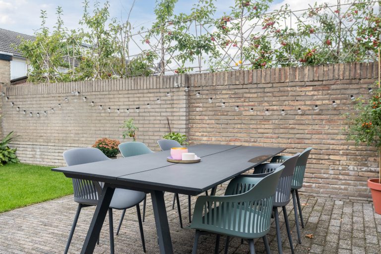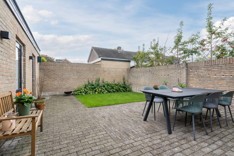 Op het zonnige zuid-westen gesitueerde achtertuin met klinkerbestrating, gazon, diverse beplanting en een achterom met poort.