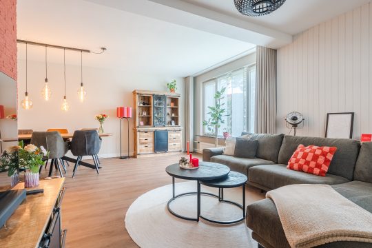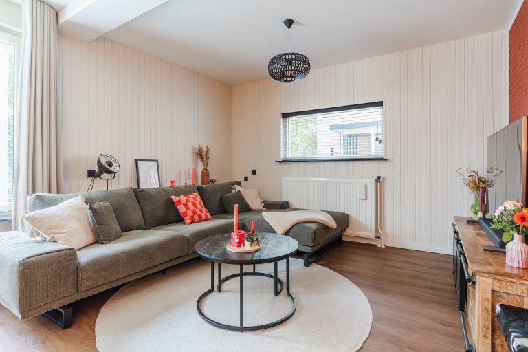 Sfeervolle woonkamer met veel lichtinval voorzien van een moderne PVC-vloer, wanden grotendeels voorzien van stucwerk en lichte schroten en een stucwerkplafond.