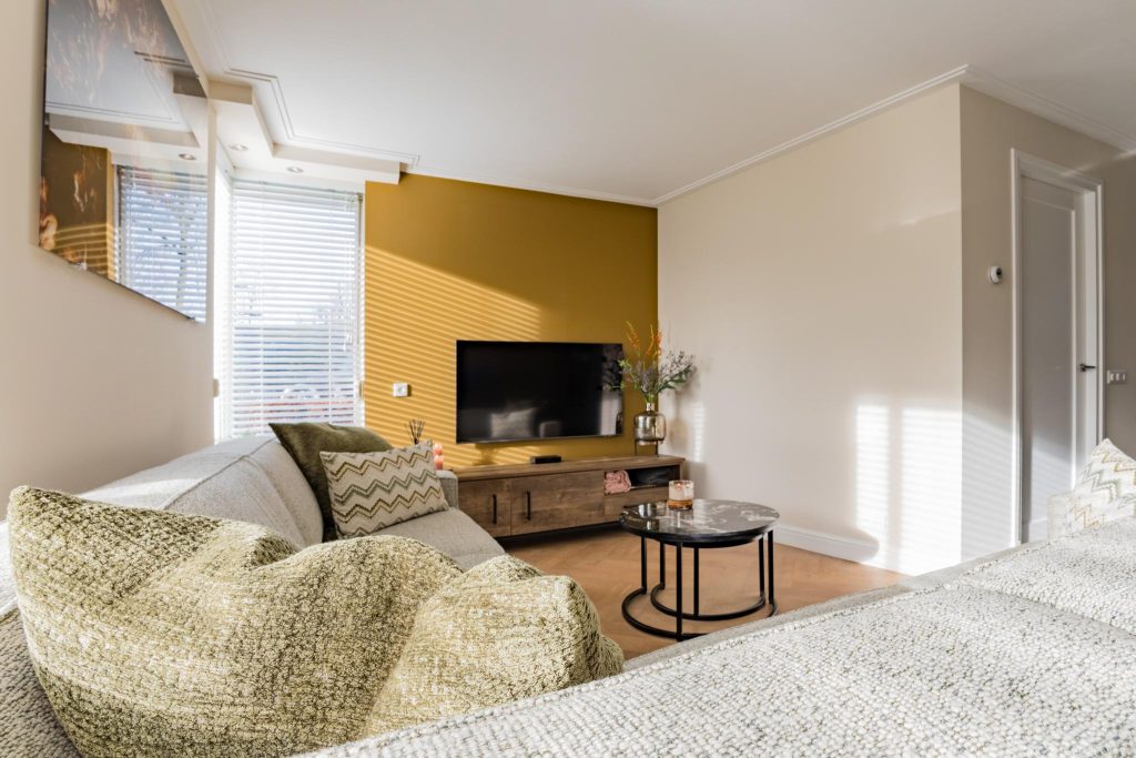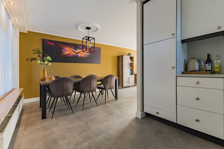 De huidige eigenaren hebben écht aan alles gedacht om hier een fijn en comfortabel huis van te maken. Aan de voorzijde is het sfeervolle zitgedeelte gelegen welke is voorzien van een prachtige massief eiken vloer in visgraat motief. Het zijraam en de erker maken het een enorm licht maar door de aanwezige zonnescreens is de ruimte ook eenvoudig te verduisteren. Verder naar achter loopt de vloer over naar een fraaie betonlook 90×90 tegel wat in combinatie met de strakke stucwerk wanden, de strakke stucwerk plafonds met sierlijst en spots een moderne uitstraling geeft. Het eetgedeelte is eveneens ruim van opzet en staat in verbinding met de open keuken.